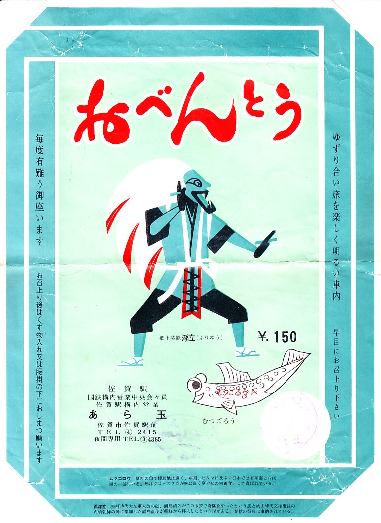 1965年頃の調製と思われる、昔の佐賀駅弁の掛紙。郷土芸能浮立(ふりゅう)と記した人物画とムツゴロウを描いた、青い掛紙。