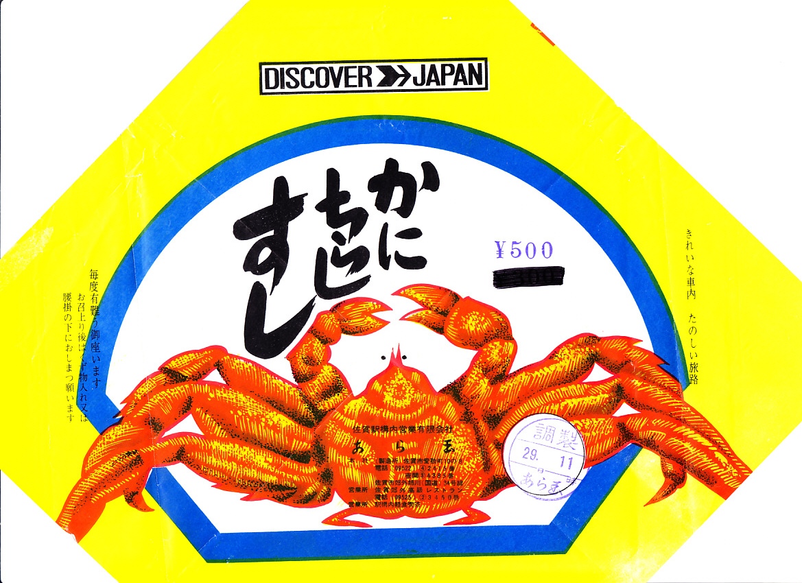 2004(平成16)年2月23日に購入した、佐賀駅弁の掛紙。昭和時代から令和まで、絵柄は変わらない。この中身の姿も昭和時代から変わらず、調味に優れた酢飯を刻み海苔、錦糸卵、細いカニ肉、グリーンピースで覆い、紅生姜や漬物などを添えていた。