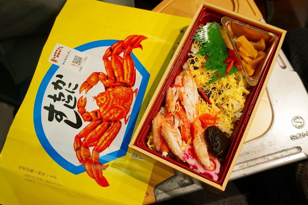 北海道でも北陸でも山陰でもない佐賀に、孤立して存在するカニ駅弁。佐賀県の有明海ではカニ漁もでき、太良町の竹崎カニは名物でもある。そのワタリガニでなくタラバガニに見える立派なカニを描く黄色い掛紙は、昭和時代から変わらないのではと思う。長方形のプラ容器に酢飯を詰め、刻み海苔と錦糸卵で覆い、カニ脚の棒肉を載せ、しいたけ、花れんこん、紅生姜、たくあんを添える。