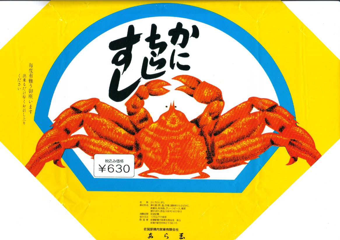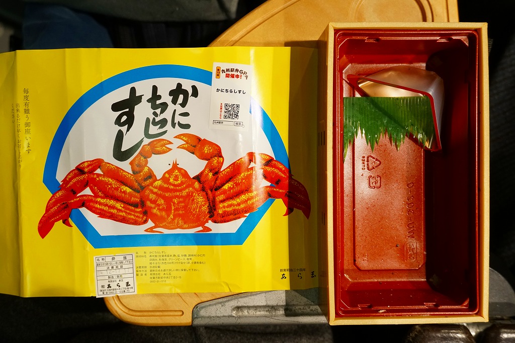 見た目では安かろう、それなりのカニ駅弁。この駅弁の特長はカニでなく酢飯にあり、その調味は調製元でも数名のみが知るという極秘扱い。甘味と酸味と何かが奥深く、おかず要らずで満腹でも食が進む。価格は2004年時点で630円、2014年4月の消費税率改定で650円。駅弁としては2016年頃までの販売と思われ、2017年にはJTB時刻表の掲載も消え、佐賀駅に何度訪れても見られなかったが、2022年10月のJR九州の駅弁キャンペーン「第13回九州駅弁グランプリ」にエントリーされ、駅での販売が860円で復活した。