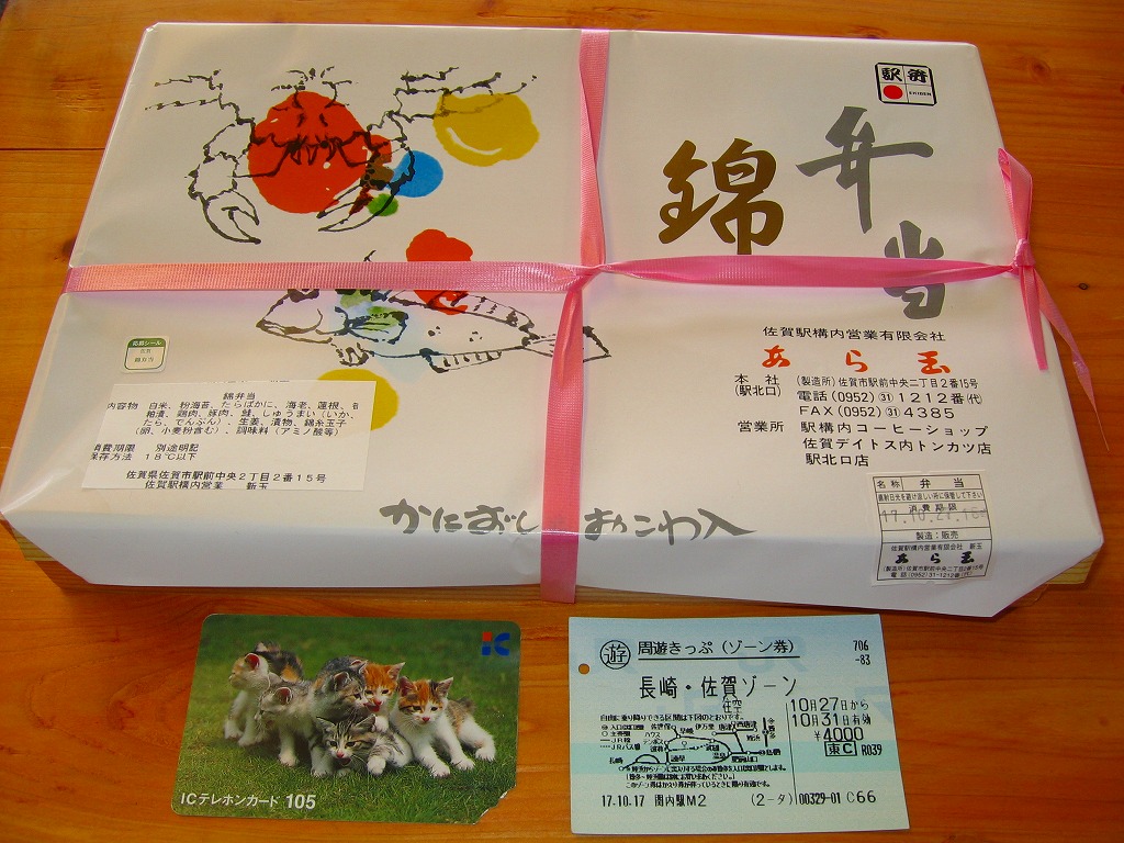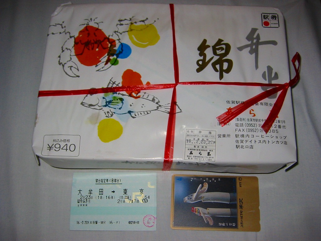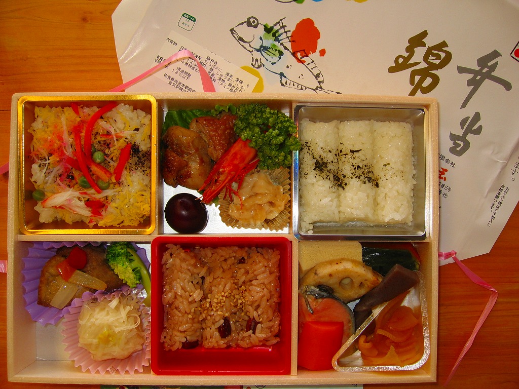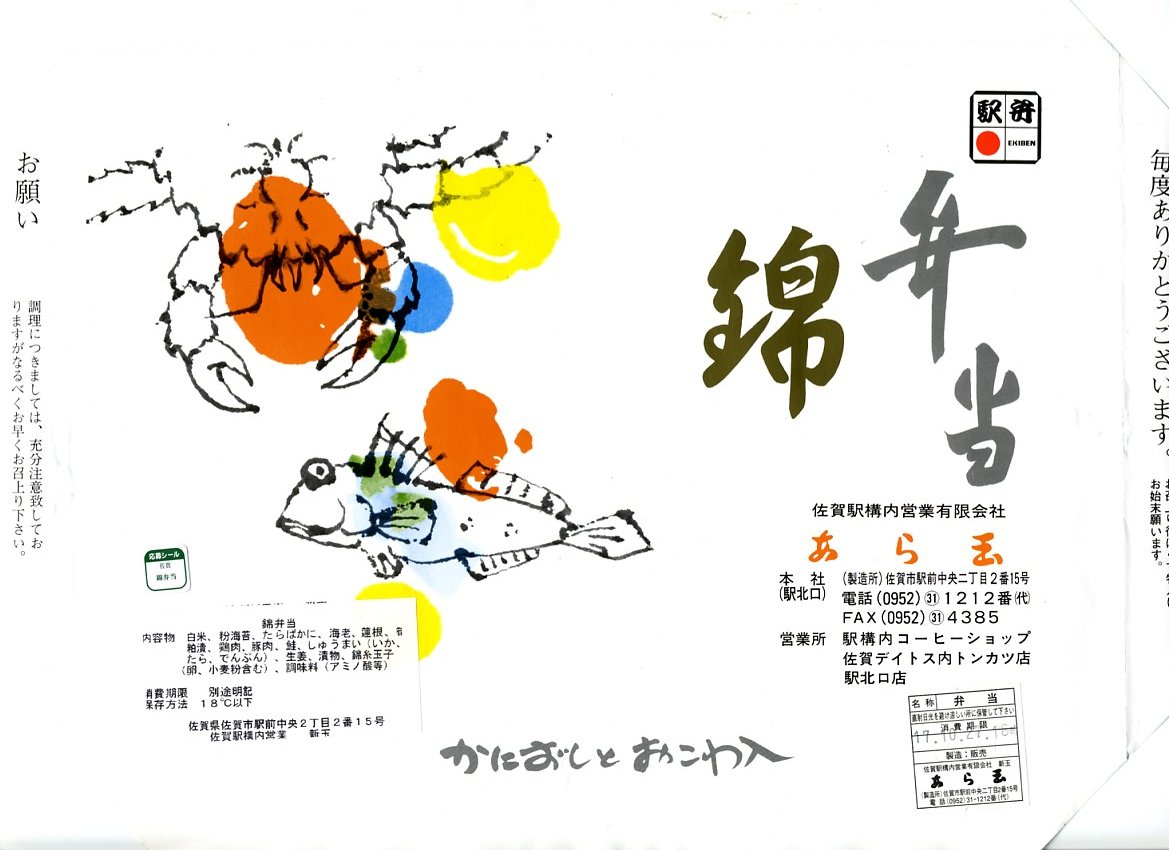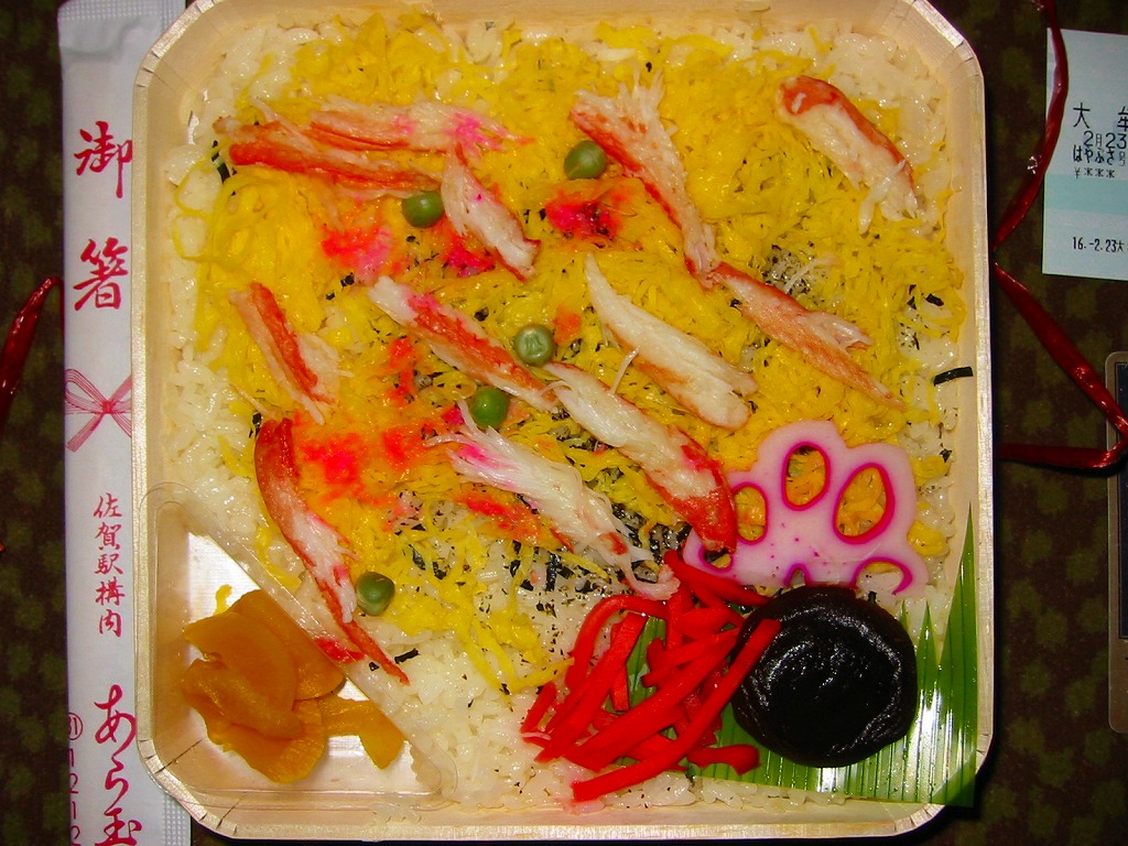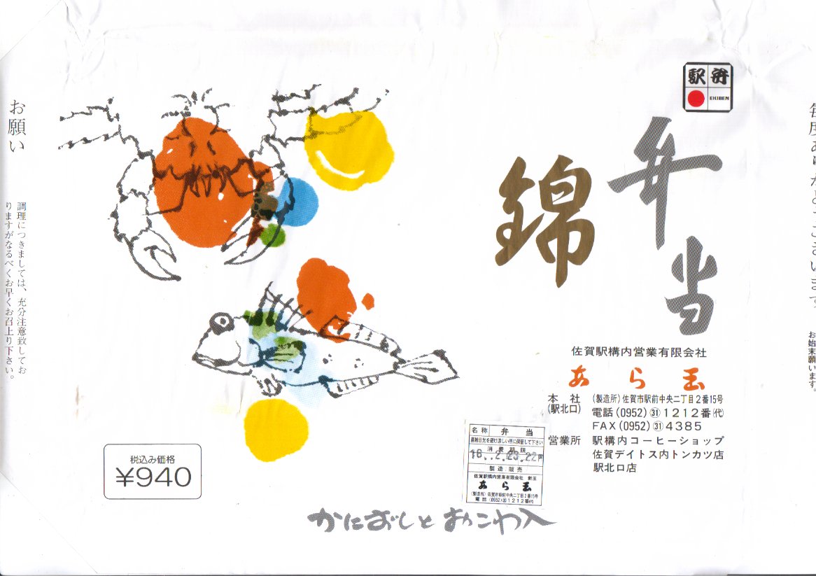 1980(昭和55)年に売り出したという、佐賀駅の幕の内駅弁。2004年の購入当時、幕の内弁当は他にも数種類が売られていたが、掛紙がかかり駅弁らしいのはこれだけ。枠も底もすべて経木の長方形の容器を、カニとムツゴロウを描く掛紙で割りばしごと包み、スズランテープでしばる。中身は紅白の俵飯に佐賀駅弁名物かにちらしずし、おかずは蒲鉾・焼き魚・玉子焼にエビフライやウインナーや竹の子など。おかずの品質に見るべきものはないが、美味い御飯が3種もあることが特徴。