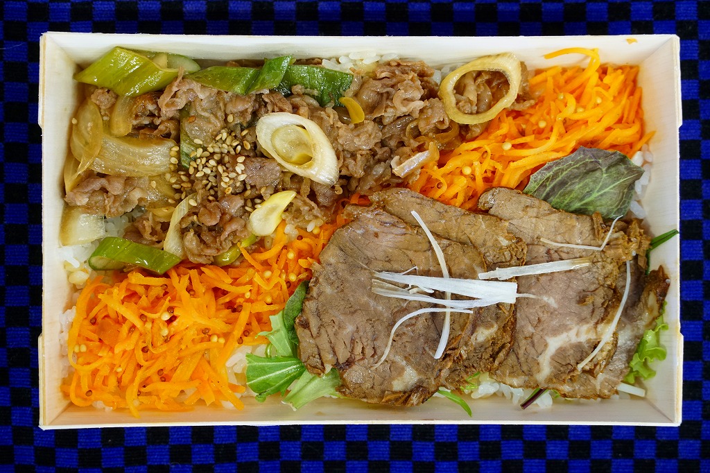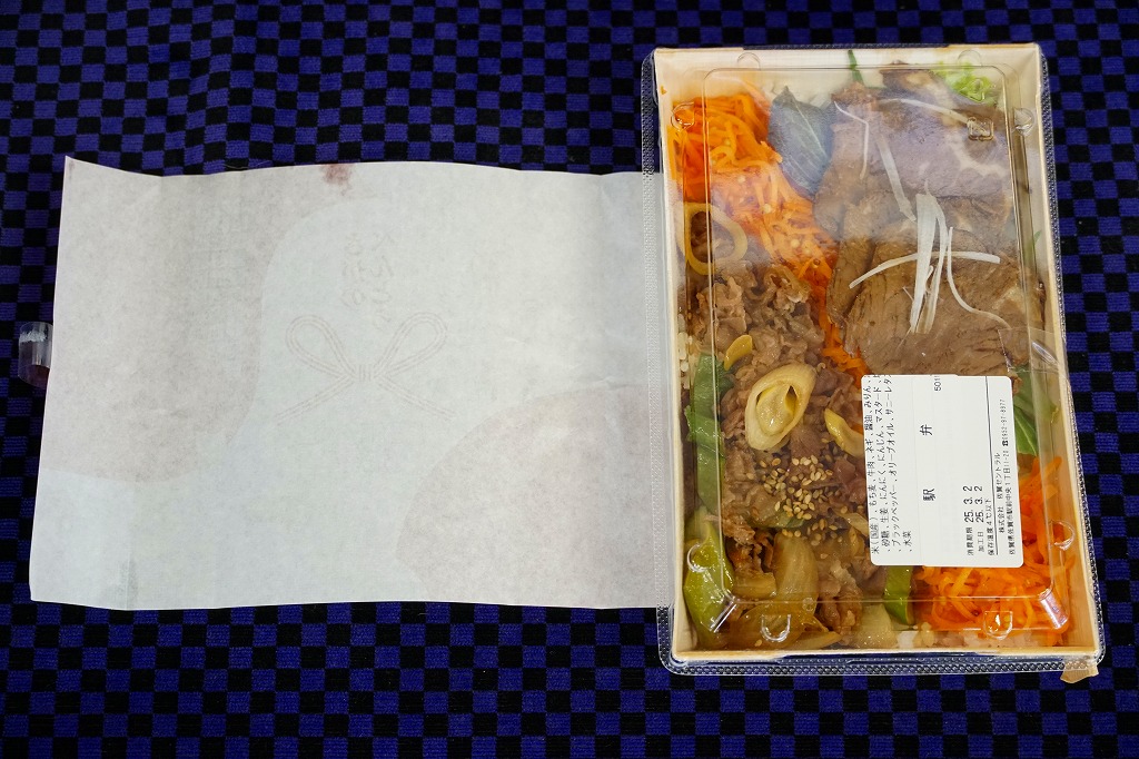 新しいカフェなどおしゃれな店でよく使われると思うタイプの木質エコ容器に白飯を敷き、佐賀県産黒毛和牛を甘い味付けのしぐれ煮のネギ混じりと、ローストビーフのようなチャーシューの水菜添えの2種類で載せ、にんじんの千切りにもち麦を振りかけて仕切る。オリーブオイルといくつかの香辛料が香る、おしゃれなカフェめしの牛肉弁当。掛紙をかけて作り置きを売る駅弁らしさと、店舗と中身と風味の駅弁らしくなさが同居し、これは今後に駅弁として客に買われるようになるかどうか。まずは上記のキャンペーンでグランプリ、準グランプリに次ぐ「特別審査員賞」を受賞したが、佐賀駅の駅弁として紹介されている感じではない。
