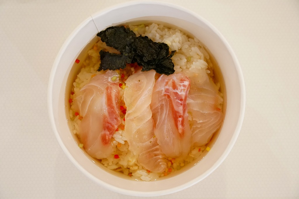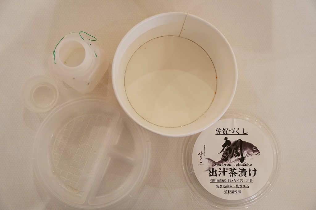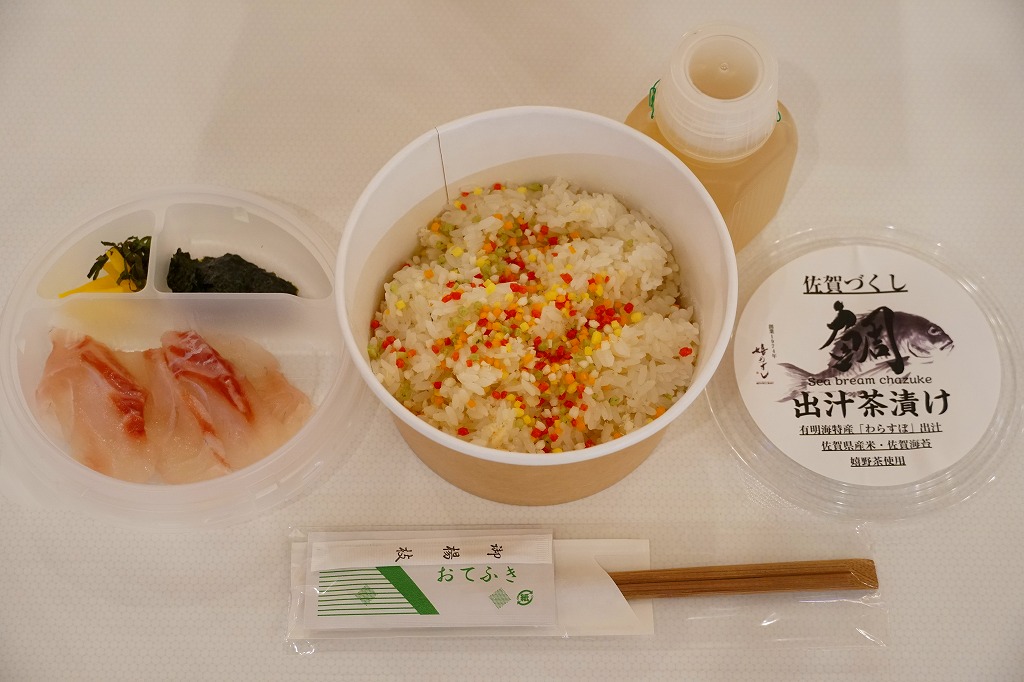 他の駅弁でもまれに使われる耐水紙のカップに、白飯を詰め、あられを振り、タイの切り身と佐賀海苔と漬物を詰めたトレーで覆い、有明海特産「わらすぼ」出汁をポリ容器で添える。まずは御飯にタイを載せて味わい、後はお茶漬けで食べる、名古屋のひつまぶしのような食べ方を推奨。滋味のある冷茶漬けができた。これを佐賀駅の駅弁として客に見てもらえるかどうかはわからない。
