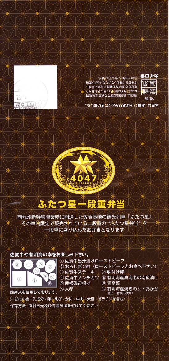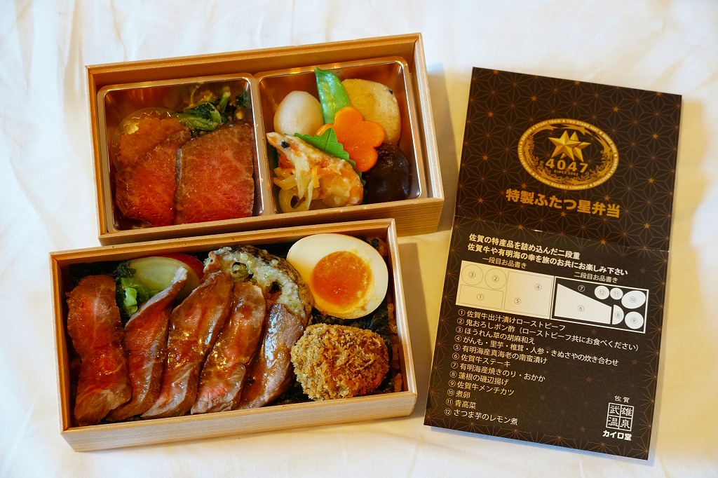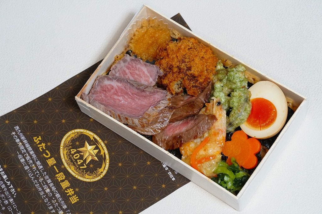 2023(令和5)年1月の、京王百貨店と阪神百貨店と鶴屋の駅弁大会で実演販売。武雄温泉駅の駅弁とも紹介されるが、駅では買えず、予約しても駅では売ってもらえない、2022年9月運転開始の観光列車「ふたつ星4047」の列車内で、事前の予約にて購入できる車内弁当「特製ふたつ星弁当」(2,520円)の、二段重を一段重に盛り込んで、目玉商品のひとつとして三大駅弁大会で販売したもの。調製元は武雄温泉駅で「佐賀牛すき焼き弁当」など人気の駅弁を売る駅弁屋。