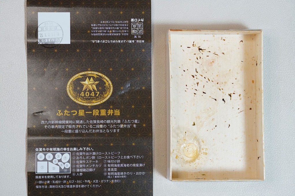 2022(令和4)年9月23日の西九州新幹線の開業日に、佐賀県と長崎県で運転を開始した観光列車「ふたつ星4047」の列車内で、事前の予約にて購入できる車内弁当。ここでは2023年1月の阪神百貨店の駅弁大会で実演販売されたものを買えた。併売した上記の催事向け模造品「ふたつ星一段重弁当」と違い、こちらは現地の現物と同じものが買えるということで、開店時から行列の人気だった。