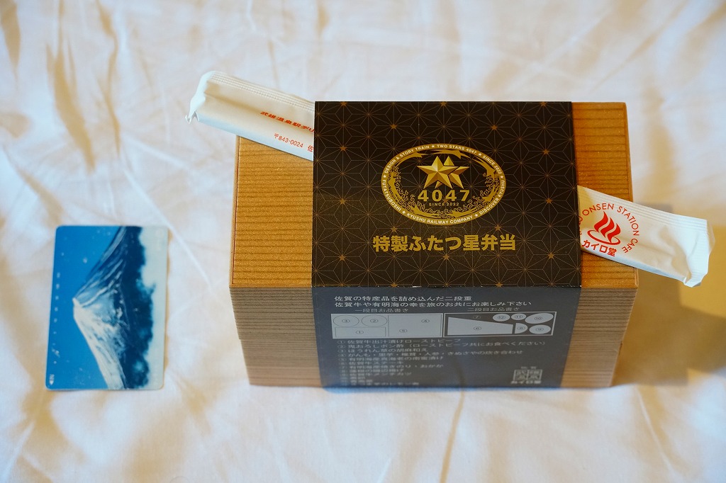 車内限定弁当「特製ふたつ星弁当」と「4047弁当」(1,440円)も、同時にデビュー。しかし購入は非常に困難。午前便限定、乗車1か月前から3営業日前までにネット上での予約と決済が必要、予約には座席番号とグーグルかラインのIDが必要なので指定席特急券の事前購入が必要、IDを取るには両社いずれかへの入会と個人情報の提供が必要、その個人情報は予約代行会社を含め共有される。今風のやり方ではあるが、これで詐欺被害に遭ってもきっと自己責任。なぜこんな売り方をするのだろうかと思う。