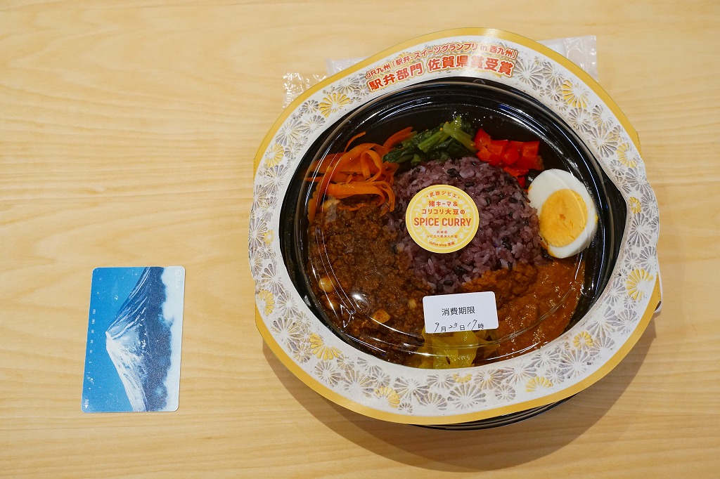西九州新幹線の開業日である2022(令和4)年9月23日に、その始発駅である武雄温泉駅の土産物店で買えたお弁当。名前はふたのシールで「武雄ジビエ猪キーマ&コリコリ大豆のSPICECURRY」、食品表示で「スパイスカレー弁当」、レシートで「はらだ酒店スパイスカレー弁当」と異なる。これはJR九州が2021年10月に始めた駅弁キャンペーン「九州駅弁グランプリin佐賀・長崎」により、事業者に対して募集した弁当で、2022年6月に「駅弁・スイーツグランプリin西九州」の結果として駅弁部門の佐賀県賞に選定した「武雄ジビエ猪キーマ&コリコリ大豆のスパイスカレー」の商品化とみられる。公式にも報道でも一切の発表がなく、現地に宣伝も掲示もなく、詳しいことは分からない。