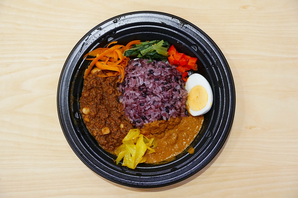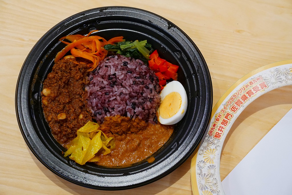 惣菜向けの丸いプラ製の平皿に、黒米混じりの御飯を据え、どろどろのカレーとキーマカレーをかけ、ゆで卵、トマト、ほうれんそう、にんじん、キャベツ漬を添えたもの。佐賀県や武雄温泉駅がどこにあるのか分からなくても、これはおいしくて美しいカレーライス。販売の事実もまた、誰も紹介することなく、年末の再訪では消えていた。既存の「佐賀牛すき焼き弁当」が強い武雄温泉駅では、もう二度と売られることはないだろうが、調製元の武雄温泉元湯に近いカフェでは、2021年新発売のメニューとして、注文できるのではないかと思う。