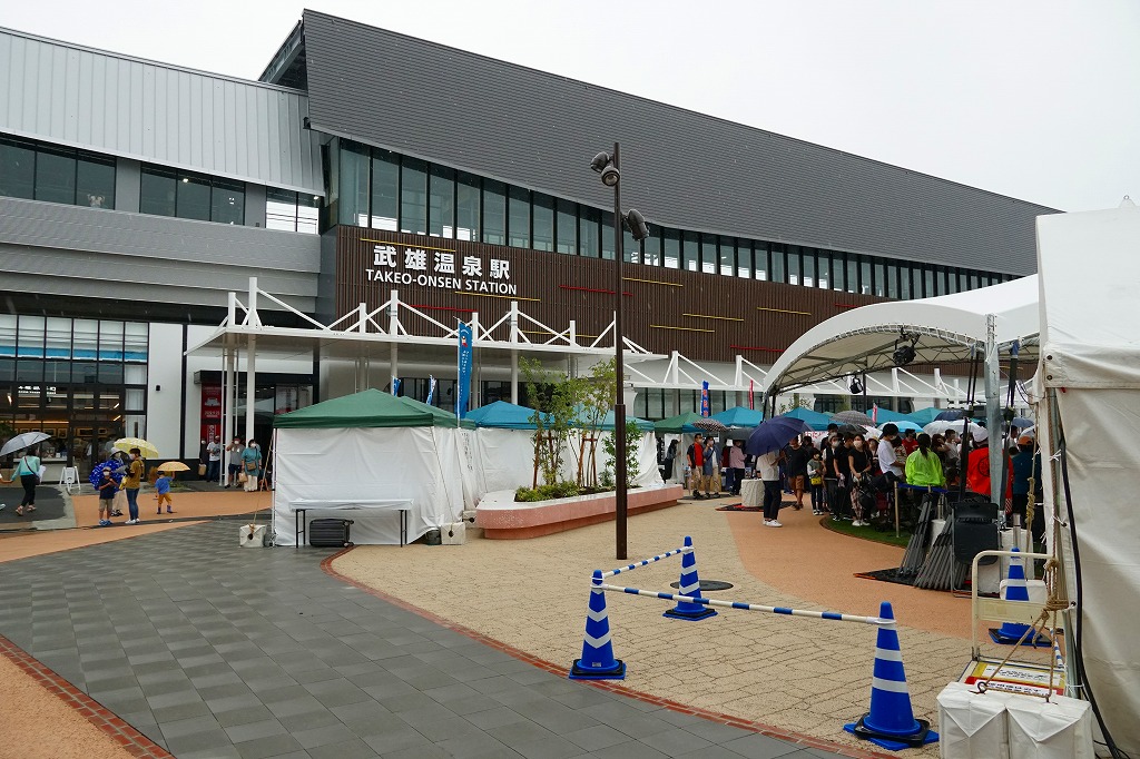 JR佐世保線武雄温泉駅付近連続立体交差事業により、地面から上空へ移動した線路の下で、2010(平成22)年3月に観光案内所と観光売店とカフェの一体施設がオープンした。同時に武雄温泉駅史上初の駅弁がそのカフェで生まれ、長らく「武雄温泉駅弁当」の文字と写真が外壁面に残るが、この商品は長続きしなかったらしい。