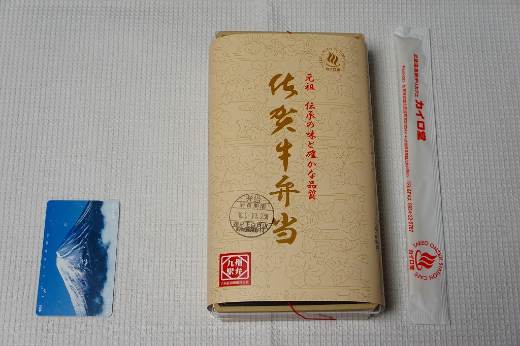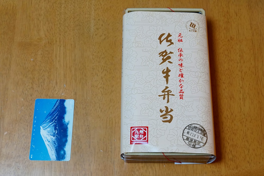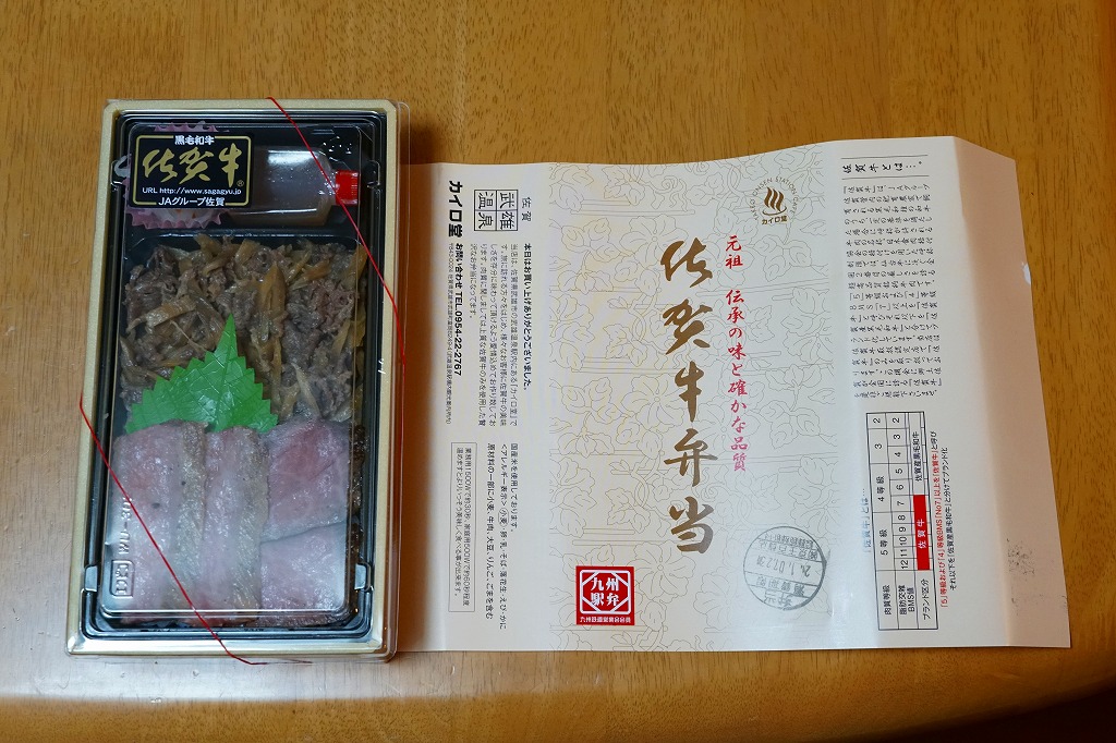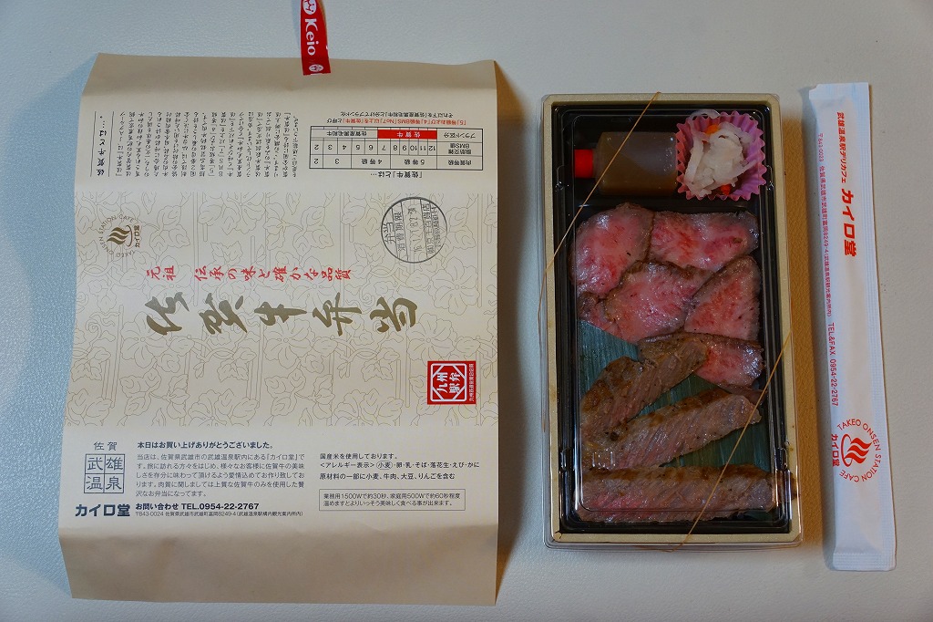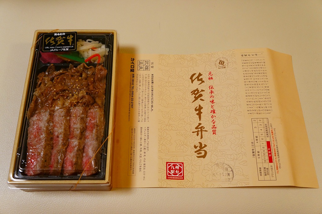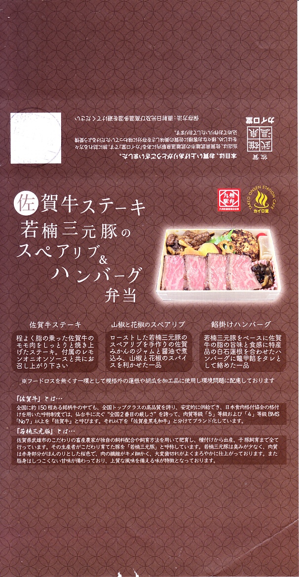 2017(平成29)年1月の京王百貨店の駅弁大会で実演販売。掛紙には「佐賀牛弁当」とあるが、百貨店での商品名は「佐賀牛ロースステーキ&カルビ弁当」であった。武雄温泉駅弁躍進の立役者である「佐賀牛すき焼き弁当」と、同じようなパッケージ。中身は百貨店での商品名のとおり、佐賀牛のロースステーキとカルビで御飯を覆うもの。東京のデパートの催事場で、行列が絶えない人気。ただ今回は、あるいはこの日は、かどうか、ロースステーキもカルビも固めで、今までのうまさがなかった感じ。半年間ほどは他の催事で売られた模様。
