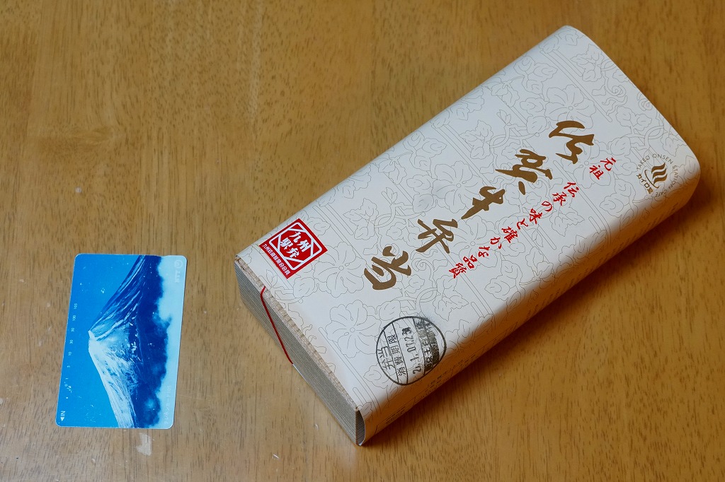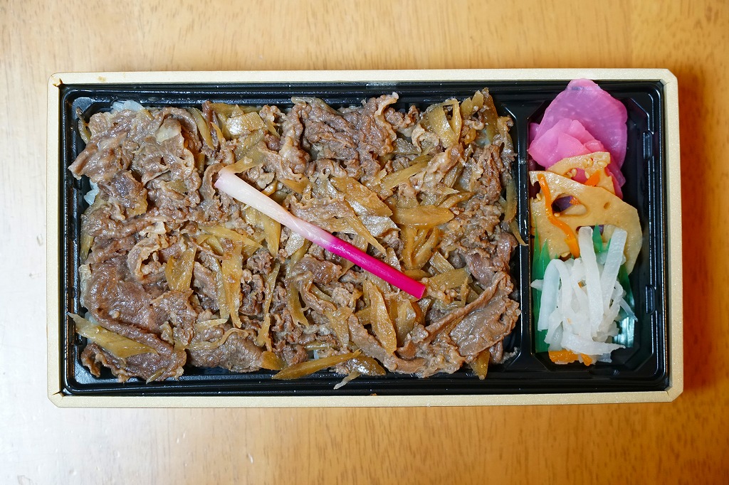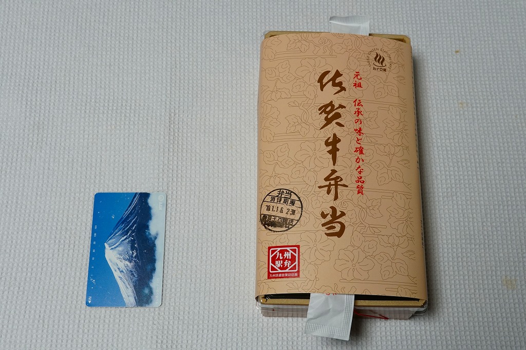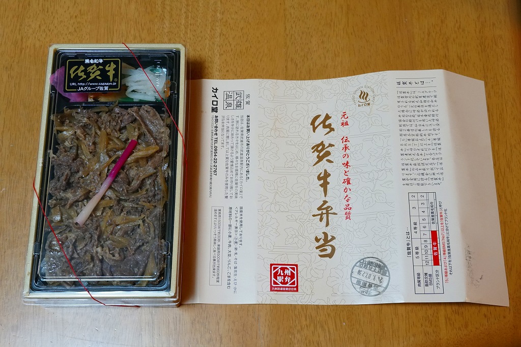 武雄温泉駅の駅弁「佐賀牛すき焼き弁当」を、京王百貨店の駅弁大会で購入したもの。掛紙がすべての実演販売商品で共通の「佐賀牛弁当」となっている。白飯を牛すき焼きで覆い、レンコンきんぴらと漬物と酢の物を添える内容は、上記の現地版と同じ。いつも催事場でも常温の牛肉駅弁として圧倒的なうまさを持っていたが、今回はなぜか牛すき焼き肉の味が平凡であり、赤身の柔らかさも脂の豊かさも香りの良さも感じられなかった。これもまさかのコロナ禍か。