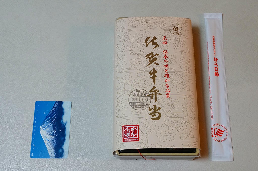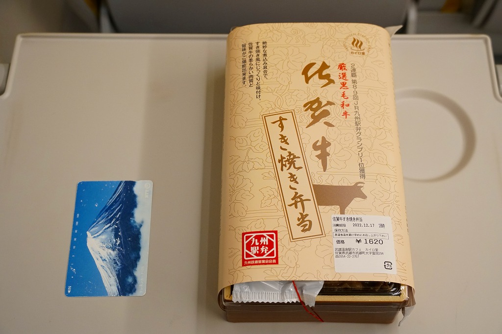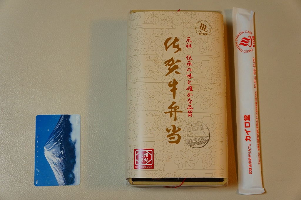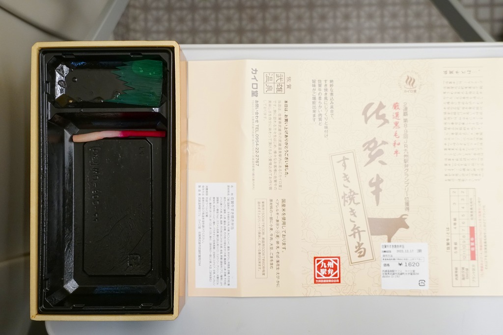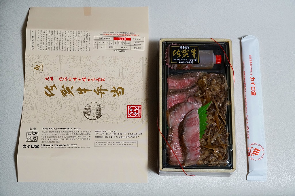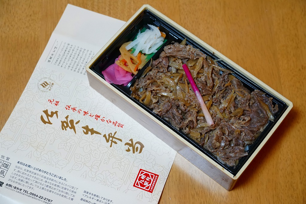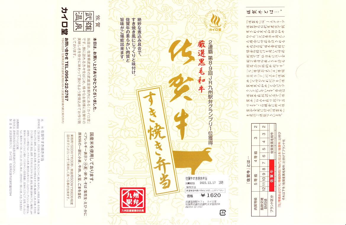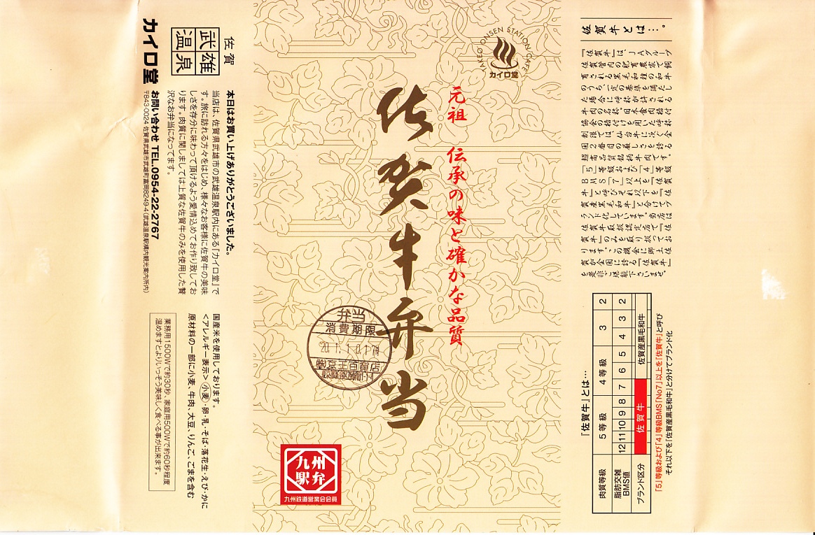 2011(平成23)年4月に武雄温泉駅の駅弁として発売。この年のJR九州の駅弁キャンペーン「第8回九州駅弁グランプリ」にエントリー。長方形のプラ容器を、商品名や宣伝文を細かく描いた、クリーム色で厚めの掛紙で包む。中身は白御飯を佐賀牛のすき焼きで覆い、蓮根きんぴら、大根なます、さくら漬けを添えるもの。牛肉の駅弁としてありふれた内容であり、佐賀牛が他のブランド牛より特に優れることもないだろうが、そこそこ厚くてにゅるにゅるとした牛肉の赤身と脂身の香りと柔らかさに、他の駅弁で思い当たらない美味さと品質の良さが感じられる。