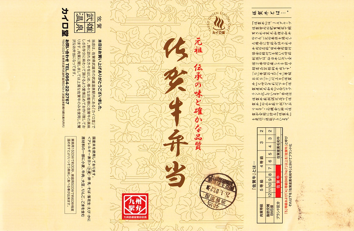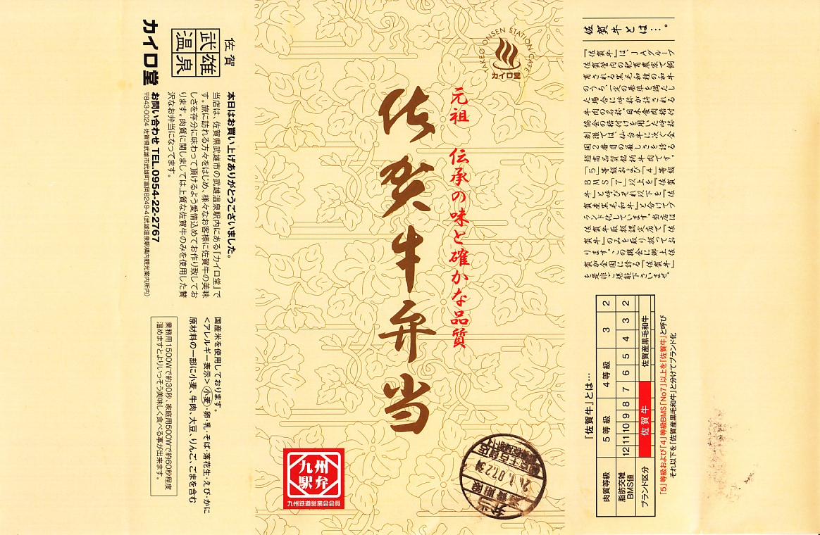 2012(平成24)年3月30日に購入した、武雄温泉駅弁の掛紙。上記の2022年のものと、書いてあることはおおむね変わらない。容器と中身は同じ。百貨店の催事場での実演販売では、この掛紙を使わず、「佐賀牛弁当」と書いた掛紙を使う。