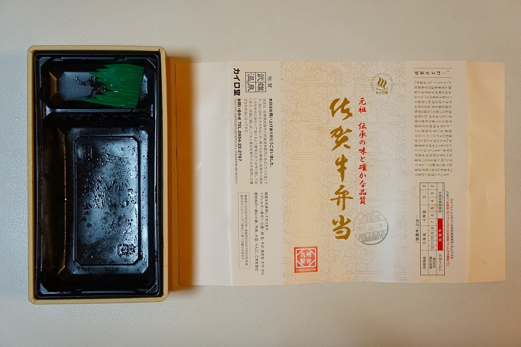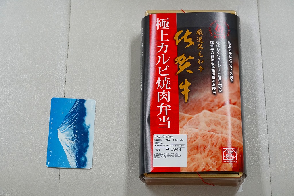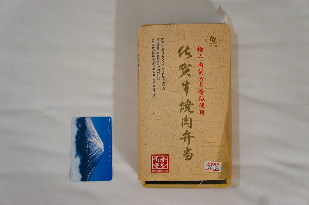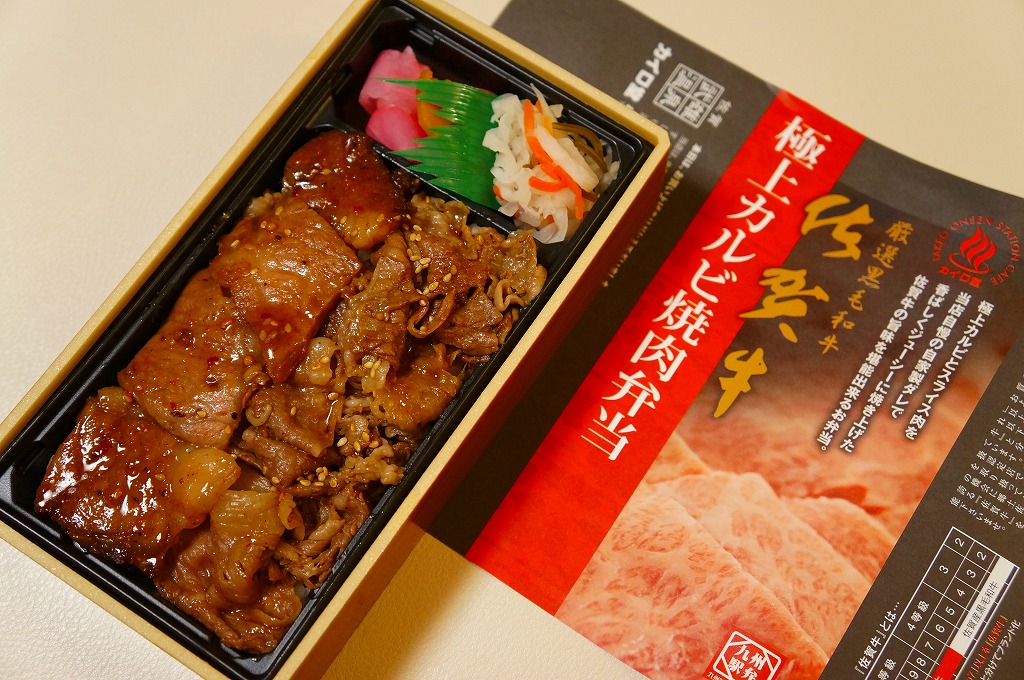 2012(平成24)年度のJR九州の駅弁キャンペーン「九州駅弁グランプリ(第9回)」へのエントリーに向け、同年10月までに発売。翌2013(平成25)年度の同キャンペーンにもエントリーされ、そこで優勝した。武雄温泉駅の他の駅弁とは違い、牛肉の写真を美しく載せた黒い掛紙を使う。容器は共通で、中身も牛肉以外は同じ。駅弁の名前のとおり、白御飯を佐賀牛の極上カルビとスライス肉の焼肉で覆う。上で何度も書いているが、常温にしても駅弁として美味すぎる焼肉弁当。価格は2012年の発売時で1,575円、2017年時点で1,620円、2019年時点で1,944円。