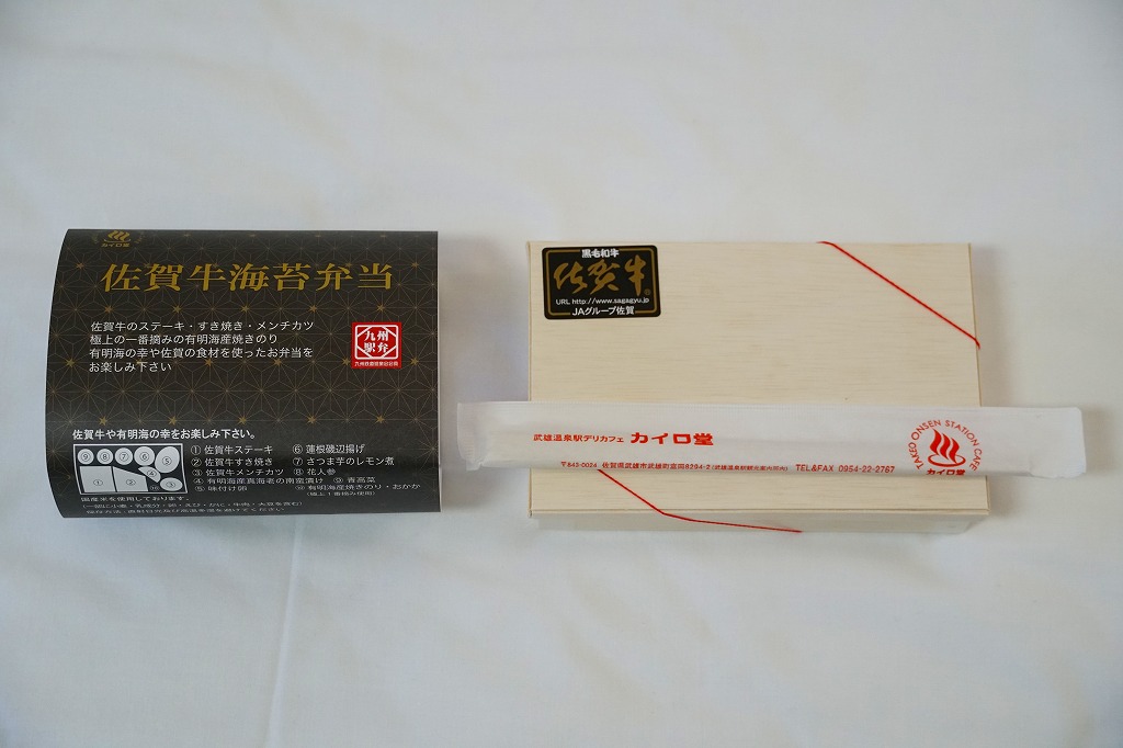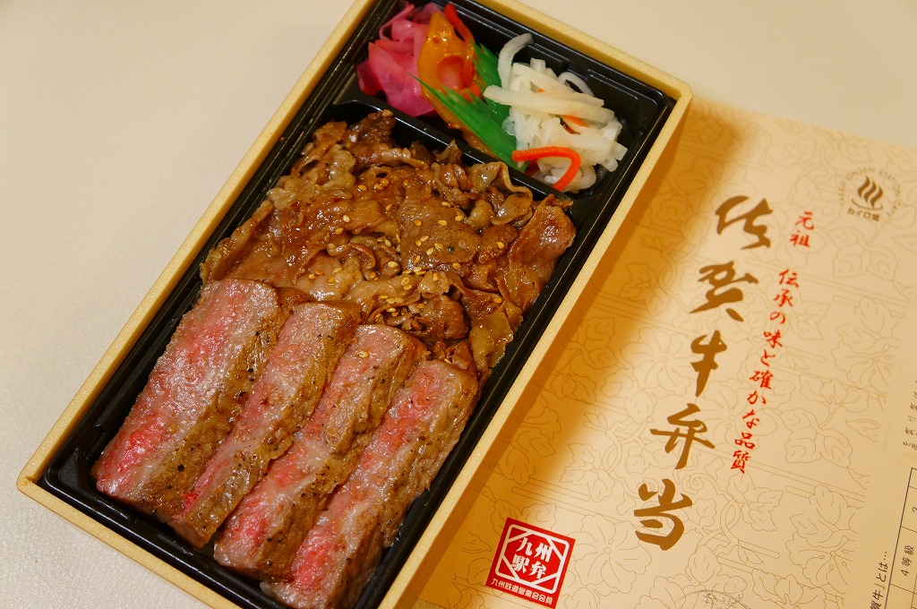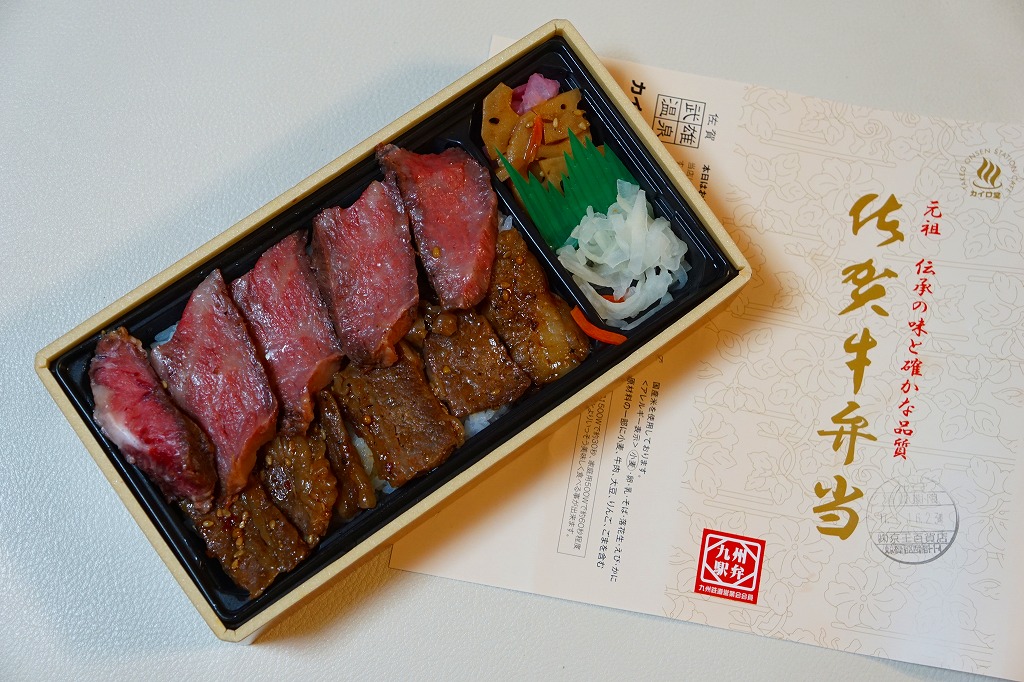 2020(令和2)年1月の京王百貨店の駅弁大会で実演販売。掛紙には「佐賀牛弁当」とあるが、百貨店での商品名は「佐賀牛ザブトンステーキ・ローストビーフ・ロースすき焼き弁当」であった。武雄温泉駅弁躍進の立役者である「佐賀牛すき焼き弁当」と、同じようなパッケージ。中身は百貨店での商品名のとおり、佐賀牛をザブトンステーキ、ローストビーフ、ロースすき焼きの3種類で分担し御飯を覆うもの。