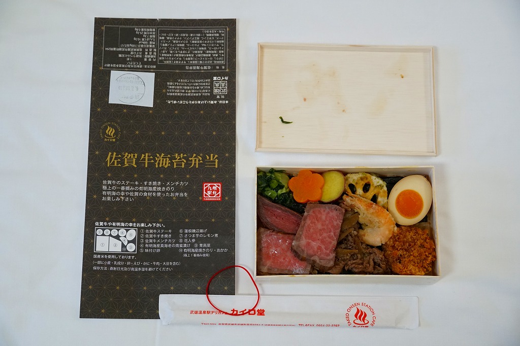 2023(令和5)年10月に武雄温泉駅などで発売、JR九州の駅弁キャンペーン「第14回九州駅弁グランプリ」にエントリー。武雄温泉駅弁の筆頭「佐賀牛すき焼き弁当」より小柄な容器に白飯を詰め、おかかと有明海苔で覆い、ステーキとすき焼きとメンチカツで3種の佐賀牛を載せ、煮玉子、れんこんの磯辺揚げ、真海老の南蛮漬け、高菜漬け、サツマイモのレモン煮を添える。