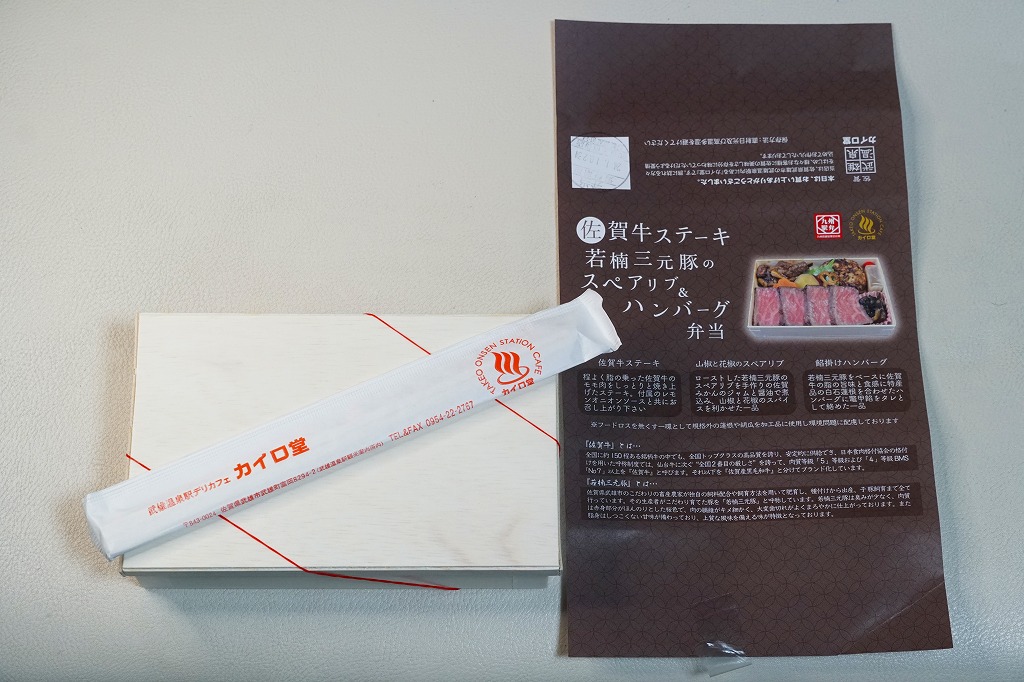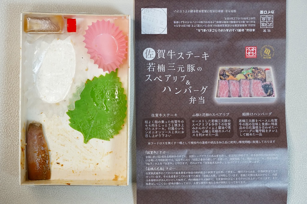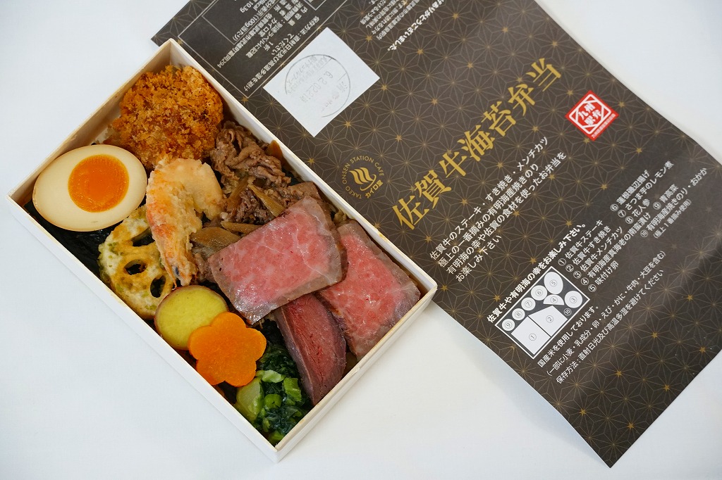 小柄な長方形のプラ容器を二段に重ね、観光列車のロゴマークとおしながきを記した黒いスリーブで留める。中身は下段がステーキ丼で、白飯を有明海産焼きのりとおかかで覆い、佐賀牛ステーキを載せ、佐賀牛メンチカツ、蓮根の磯辺揚げ、煮玉子、サツマイモを添えるもの。上段がおかずで、佐賀牛のローストビーフと鬼おろしポン酢、里芋や椎茸などの炊合せ、有明海産真海老の南蛮漬け、ほうれんそうの胡麻和え。調製元の武雄温泉駅弁と同じく、上質でおいしいステーキ丼。