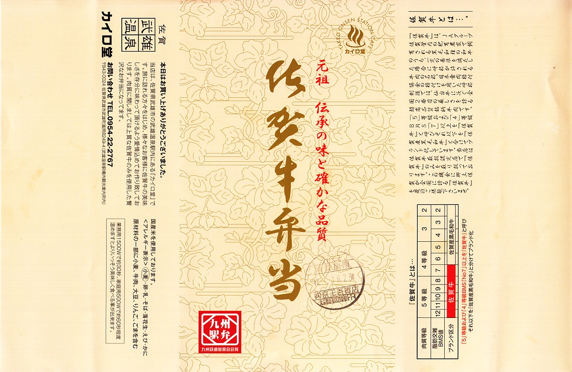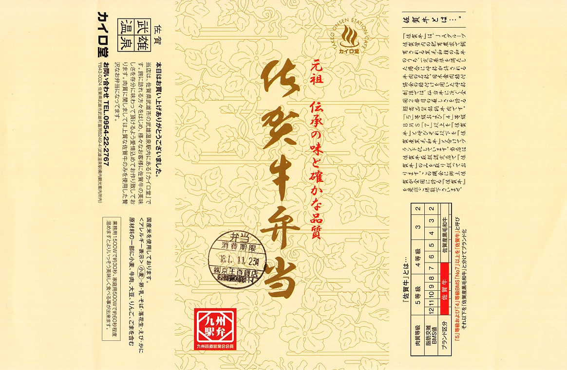 2014(平成26)年1月17日に購入した、武雄温泉駅弁の掛紙。京王百貨店の駅弁大会で購入。この時は掛紙も容器も中身も価格も風味も、現地と同じであった。後の実演販売では「佐賀牛弁当」の掛紙を使い、肉の内容をアレンジしてくる。