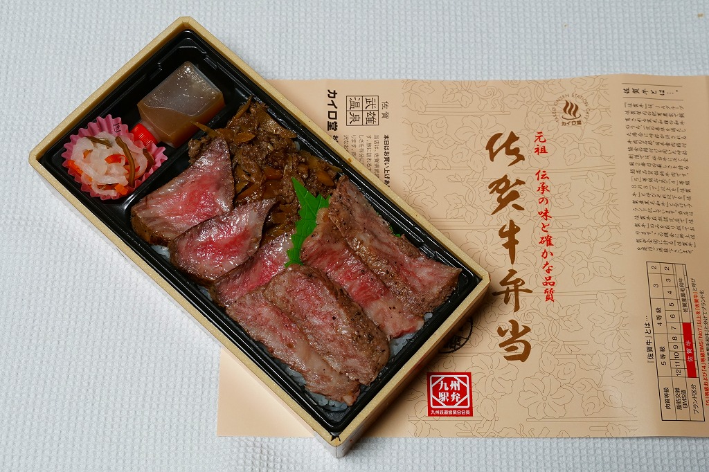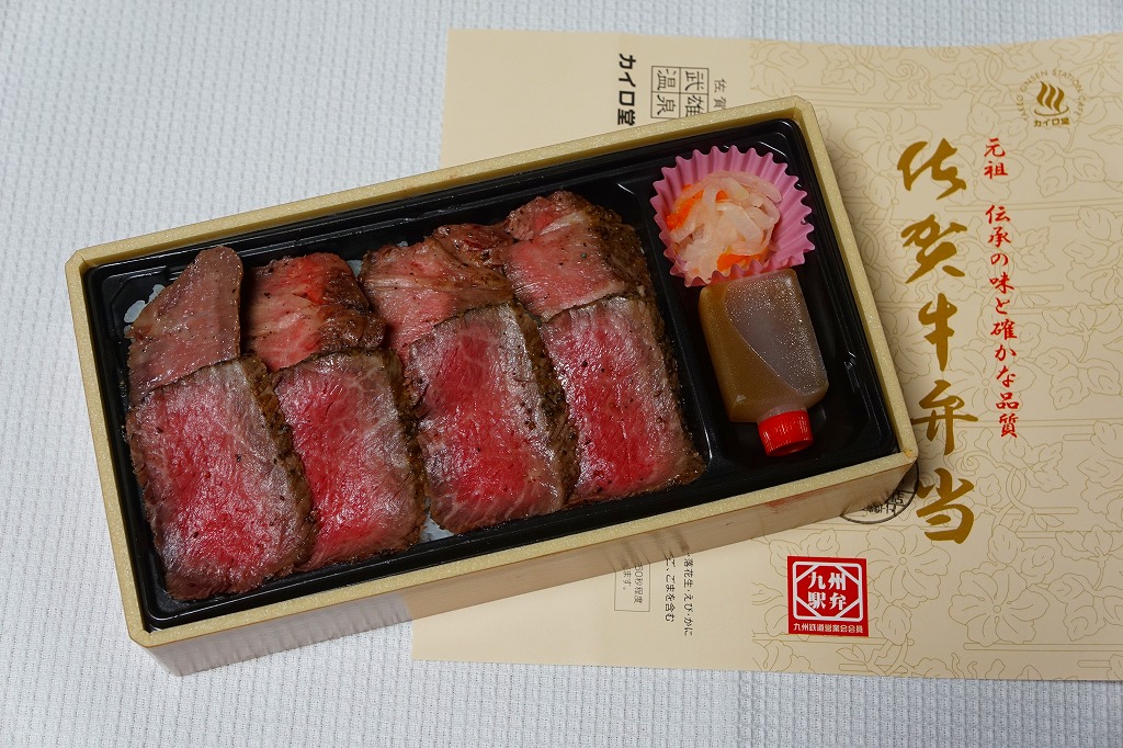 2019(平成31)年1月の京王百貨店の駅弁大会で実演販売。掛紙には「佐賀牛弁当」とあるが、百貨店での商品名は「佐賀牛ロースステーキ三昧弁当」であった。武雄温泉駅弁躍進の立役者である「佐賀牛すき焼き弁当」と、同じようなパッケージ。中身は百貨店での商品名のとおり、佐賀牛をロースステーキ、ローストビーフ、バラ肉の煮込みの3種類で分担し御飯を覆うもの。