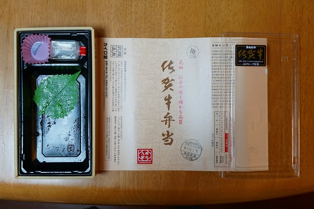 味付飯の上を有明海産の焼きのりとおかかで覆い、佐賀牛出汁漬けローストビーフ、おろしポン酢、佐賀牛ステーキ、佐賀牛メンチカツ、蓮根磯辺揚げ、人参、味付け卵、有明海産真海老の南蛮漬け、青高菜で覆う。小柄で具だくさんの牛ステーキ弁当であり、牛肉が前面で全面で強い武雄温泉駅弁に対して、牛肉が控えめで味わい深い小箱になっていたと思う。