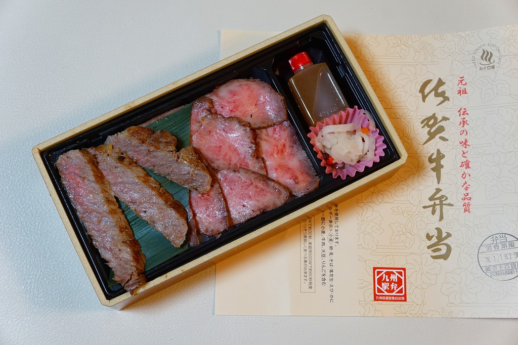 2021(令和3)年1月の京王百貨店の駅弁大会で実演販売。掛紙には「佐賀牛弁当」とあるが、百貨店での商品名は「佐賀牛サーロインとランプステーキ&すき焼き弁当」であった。佐賀牛すき焼き弁当と同じ容器と、この実演販売で共通の掛紙を使う。中身は白飯を牛ステーキと牛すき焼きで覆い、酢の物とタレを添えるもの。ステーキはさすがの常温でとろける霜降り牛。一方で牛すき焼き肉の味が平凡だったのは意外。この年の阪神百貨店や鶴屋百貨店の駅弁大会でも実演販売された。それ以外の場所で売られたかどうかは分からない。
