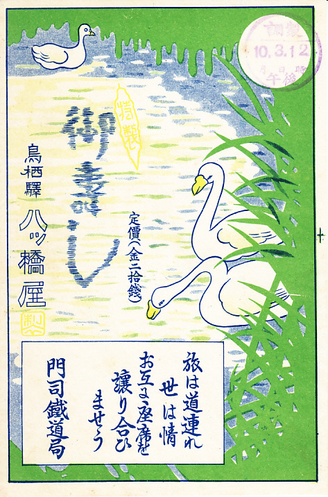 1935(昭和10)年3月12日午後の調製と思われる、昔の鳥栖駅弁の掛紙。絵柄は冬の九州に渡ることもあるコハクチョウか。