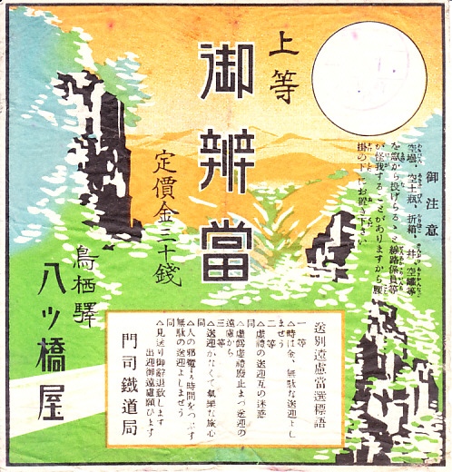 おそらく1930年代のものと思われる、昔の鳥栖駅弁の掛紙。鳥栖とは思えない山河の風景に、門司鉄道局が1926(大正15)年に募集したという送迎遠慮標語(または送迎廃止標語)の当選作を列記した。上等弁当で価格が30銭なので、1926年の掛紙ではないと推定した。