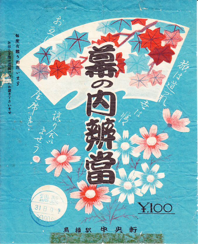 1950年代のものと思われる、昔の鳥栖駅弁の掛紙。「鳥栖駅 中央軒」の文字がないと、どこの駅弁なのか分からないくらい、特段の個性がない絵柄である。