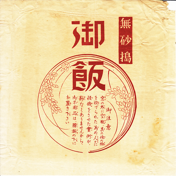 1950年代のものと思われる、昔の鳥栖駅弁の掛紙。入手状況から2枚組、おかずと御飯の容器ごとに掛紙を持っていたと思われる。御飯の「無砂搗(むさつき)」とは、搗粉(つきこ)あるいは磨砂(みがきずな)を使わず精米したことを指す。1955(昭和30)年に通風摩擦式精米機が発明されるまで、効率的にな精米には砂を混ぜることが、混砂搗が必要だった。