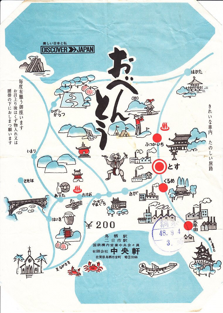 1973(昭和48)年9月4日3時の調製と思われる、昔の鳥栖駅弁の掛紙。西九州の地図と国鉄路線図と名所のイラストが略図で描かれる。当時に中央軒という駅弁屋があった、鳥栖駅、二日市駅、久留米駅、大牟田駅が赤丸で描かれる。