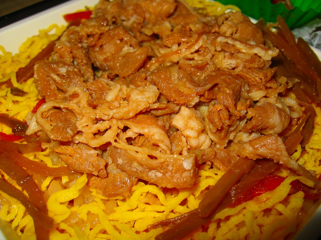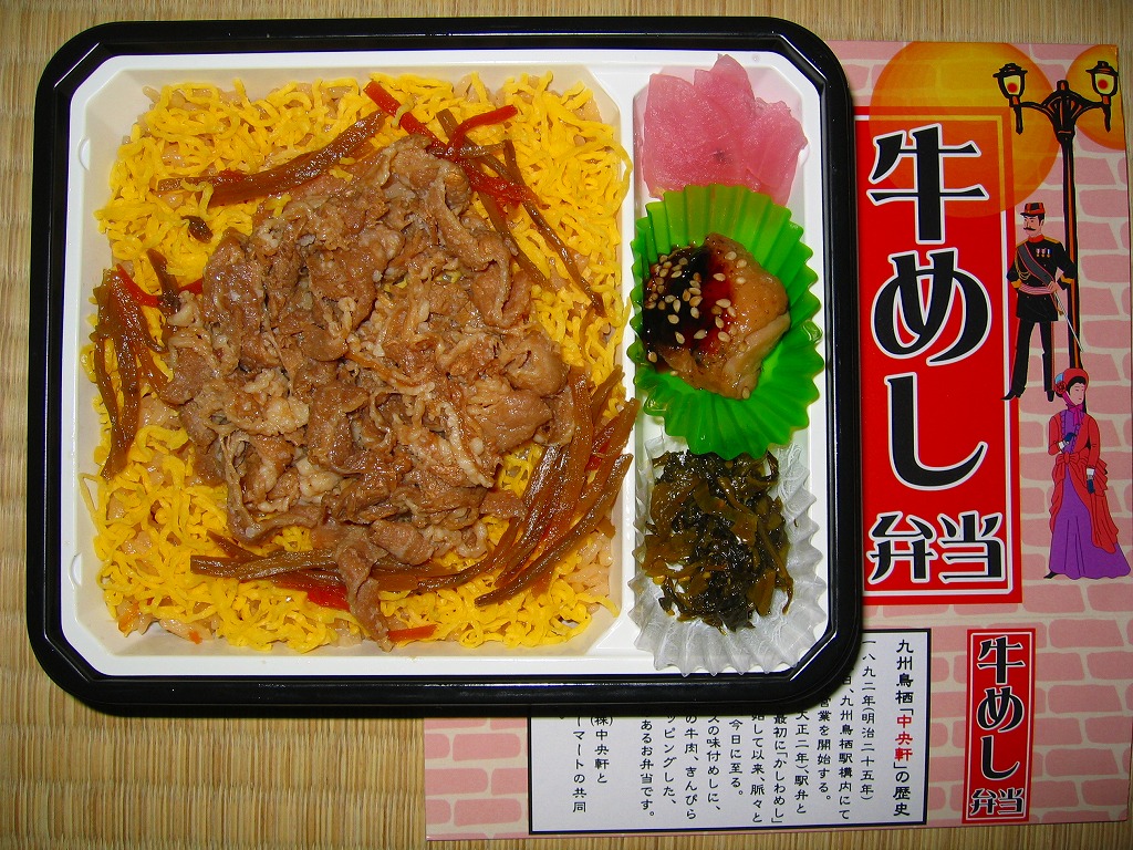 鳥栖駅の駅弁屋である中央軒の監修により、2006(平成18)年3月7日から20日まで、コンビニエンスストア大手のファミリーマートの全国各地の店舗で販売された商品。中が白く外が黒いプラ容器に、味付飯を詰めて錦糸卵としぐれ煮風牛肉などを載せて、鶏肉と高菜などを添える。