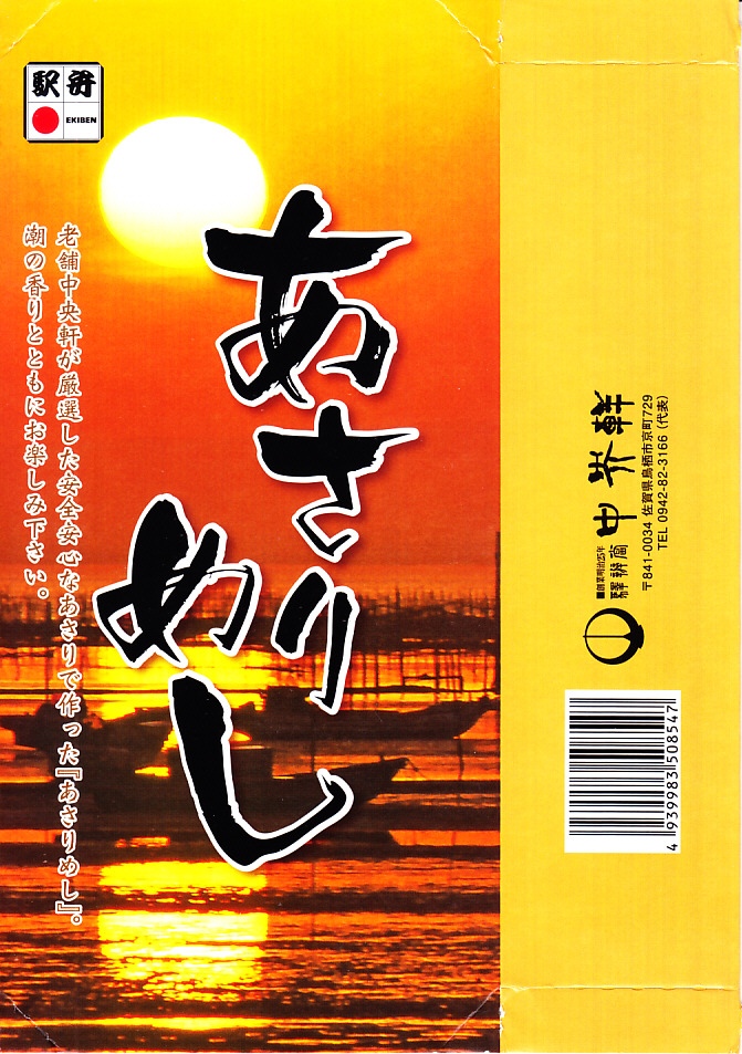 おそらくJR九州の駅弁キャンペーン「第4回九州の駅弁ランキング」の開催に向けて、2007(平成19)年の秋に発売。2014年の第11回九州駅弁グランプリにもエントリー。長方形のプラ容器を、ノリ養殖が盛んな有明海の夕景と思われる写真を使うスリーブに収める。中身は味付け御飯の上を、アサリと太めの錦糸卵で半分ずつ覆い、菜の花と山ゴボウにうみたけ粕漬を添えるもの。