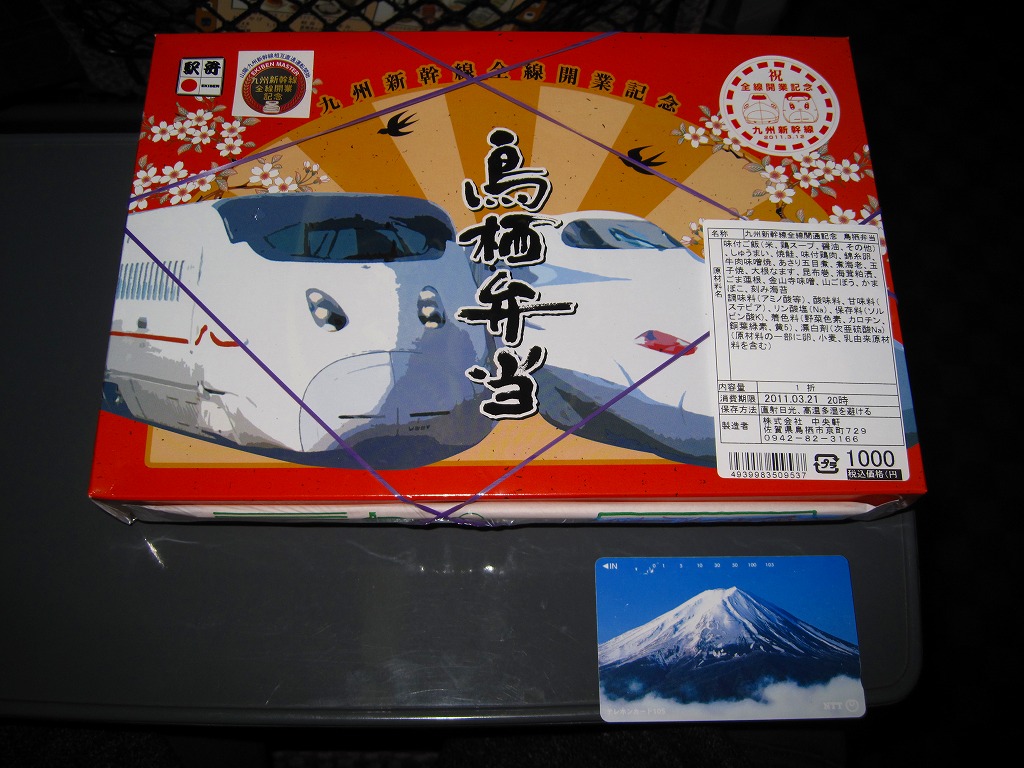 九州新幹線全線開業記念駅弁22種のひとつとして、2011(平成23)年1月1日から8月31日まで販売。九州新幹線を走るN700系電車と800系電車を描いたボール紙の箱を使用、中身はかしわめしの周りを左下から時計回りに、大根なます、アサリ五目煮、牛肉味噌焼と昆布巻とゴマ蓮根、焼鮭と煮エビと山ごぼう、焼麦と玉子焼とかまぼこ、海茸粕漬、金山寺味噌のおかずで囲むもの。