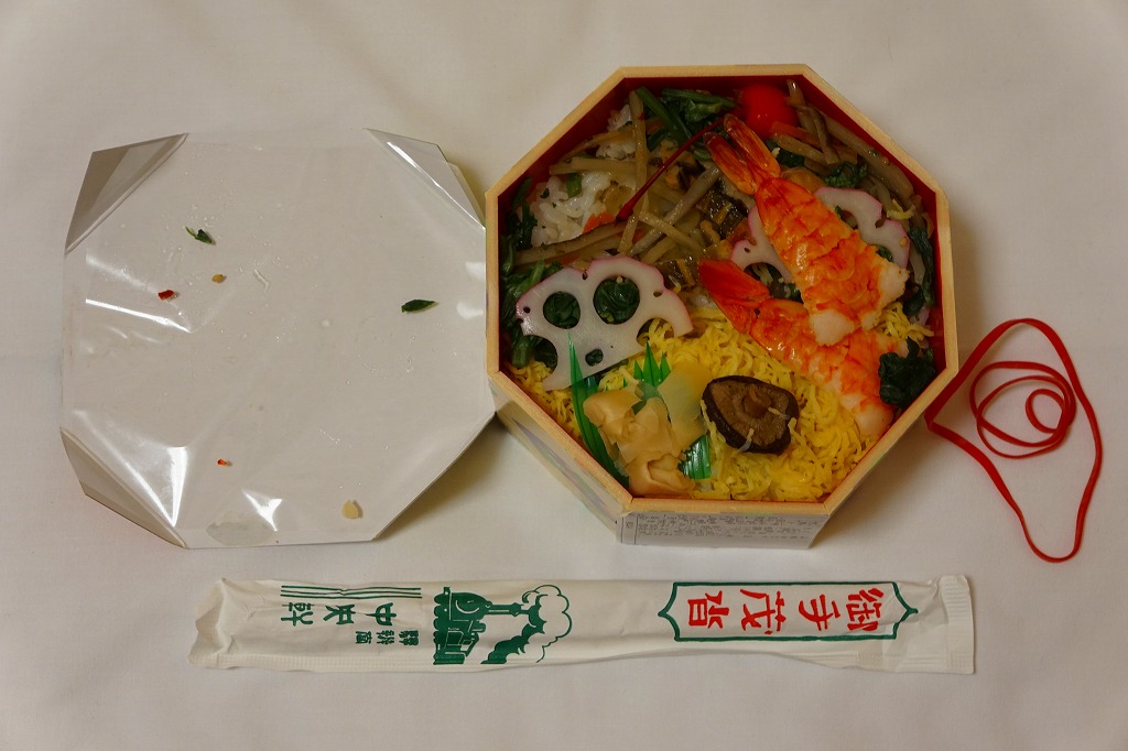 鳥栖駅の駅弁である、この無名のちらし寿しは、いつから売られているのだろうか。正八角形の容器に酢飯を敷き、錦糸卵と山菜やごぼうで覆い、海老、椎茸、蓮根、甘酢生姜などを散らす。価格は2010年時点で740円、2014年時点で760円、2023年時点で780円、2024年12月から830円。