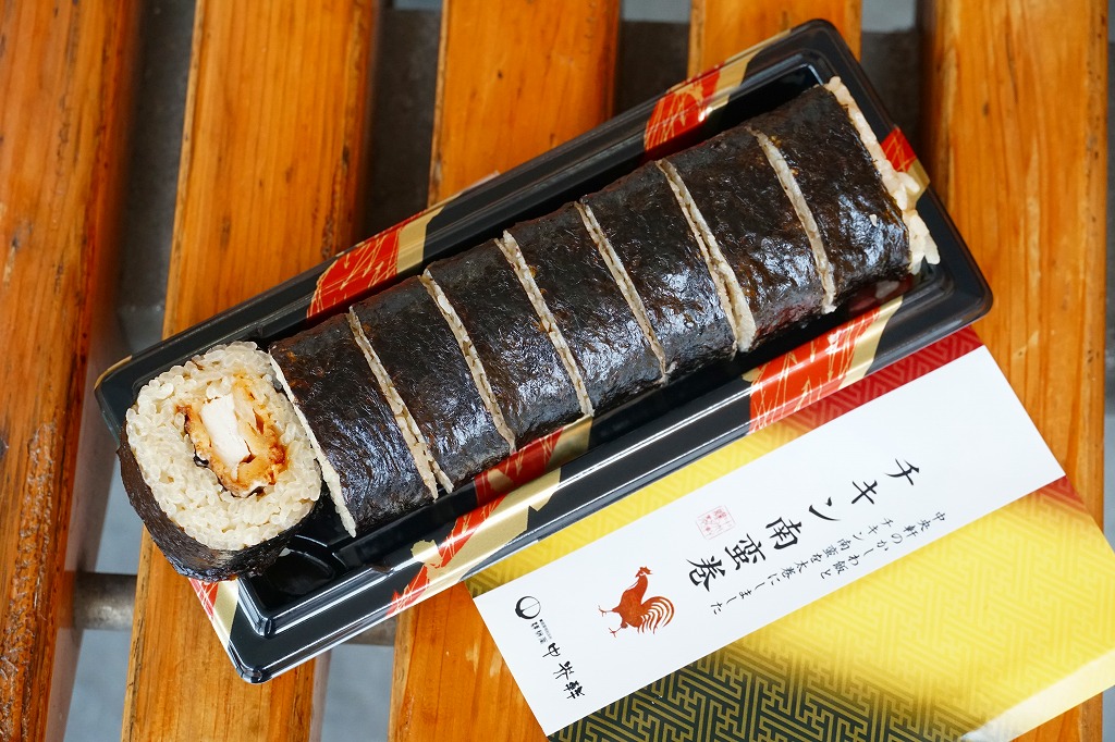 2024(令和6)年2月17日に鳥栖駅と新鳥栖駅で、「かしわのり巻」(560円)と「チキン南蛮巻」(600円)を新発売。寿司惣菜向けプラ製トレーに巻いた、商品名を記した掛紙の色彩は、かしわめしの三色ストライプにみえる。中身は太巻きが8切れ1本のみ。チキン南蛮を、駅弁のかしわめしで使われる鶏飯の御飯と、海苔で巻いたものであり、寿司でなく飯となる。鶏飯駅弁の元祖とされる駅に出てきた、ありそうでなかったタイプの鶏飯駅弁。棒状なので食べやすく、付合せも何もないシンプルさで、この内容なので価格も控えめ。8月14日に中身を4切れに半減し400円の商品へリニューアル。