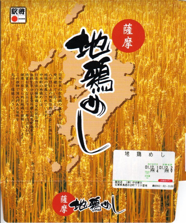 2001(平成13)年に発売。天然記念物である薩摩鶏の血を2分の1以上引き、1年以上かけて飼育した地鶏を使用、味付け御飯の上に錦糸卵を添えて載せる。日本で初めて鶏飯の駅弁を作ったという調製元だけに味は確かで、価格が抑えられている点も嬉しい。ただし、鳥栖は薩摩ではなく肥前の国に属する。2006年頃に販売を終えた模様。