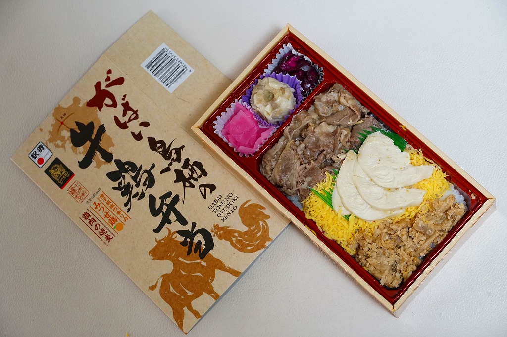 2021(令和3)年10月に鳥栖駅と新鳥栖駅で発売。酢飯を和牛しぐれ煮と錦糸卵と佐賀みつせ鶏の柚子胡椒風味のフレークで覆い、鶏ささみを並べ、鶏しゅうまい、柴漬け、大根桜漬を添える。映画や高校野球で2007年頃に流行した佐賀弁「がばい」と、昭和時代の鳥栖駅弁「とりちらし寿し」にヒントを得たのかもしれない、お肉で酢飯を食べるお弁当。名前も見た目も、現地というよりはむしろ催事で売りそうな駅弁に思えて、しかし催事でその姿を見たことがない、現地の駅弁。価格は2021年の発売時で1,000円、2024年時点で1,200円。