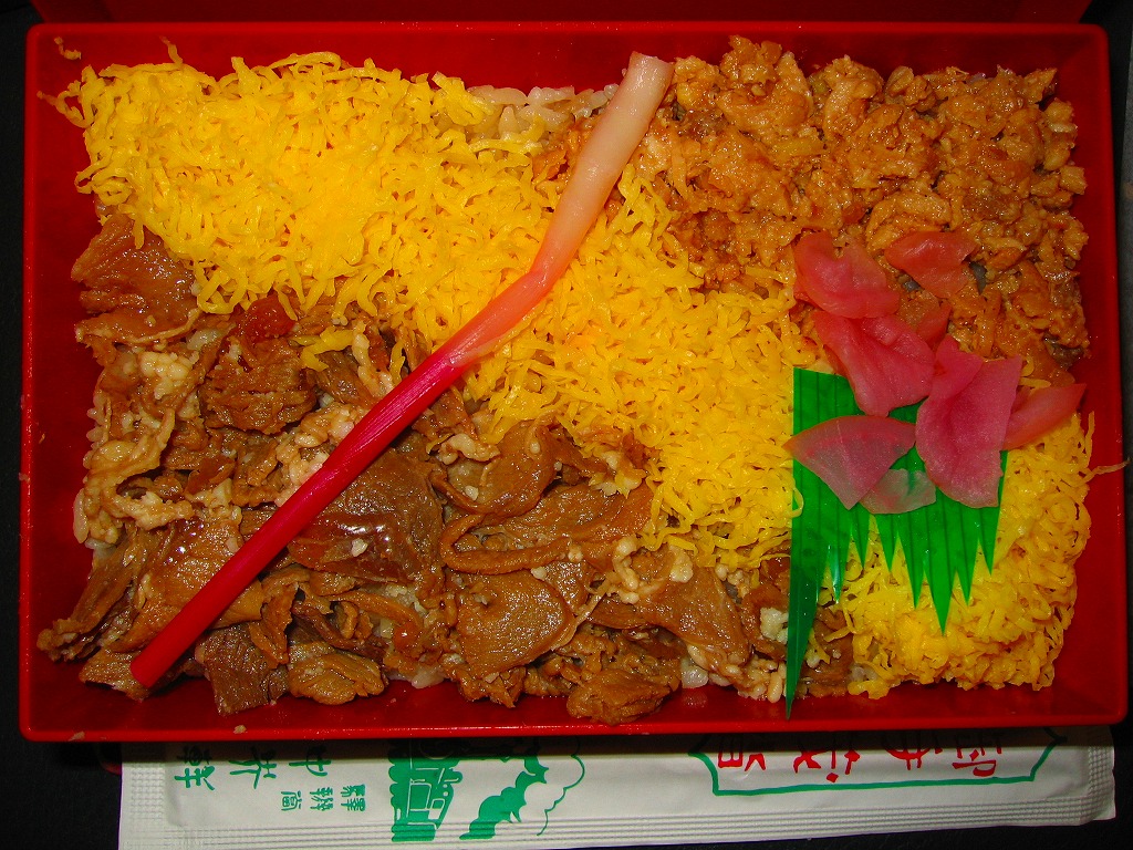 2004(平成16)年の秋頃に発売か。下記の駅弁「辛子めんたい弁当」とまったく同じ赤いプラ容器を、赤と緑で地柄と文字の色を逆にしたスリーブに収める。中身は茶飯の上を、鶏フレークと錦糸卵と牛肉のストライプで覆い、はじかみと大根桜漬を載せたもの。つまり「かしわめし」と「牛めし弁当」を足して2で割ったもの。「三昧」というほど肉が大量に入るわけはないが、牛鶏丼の感覚でモリモリと食べられる。