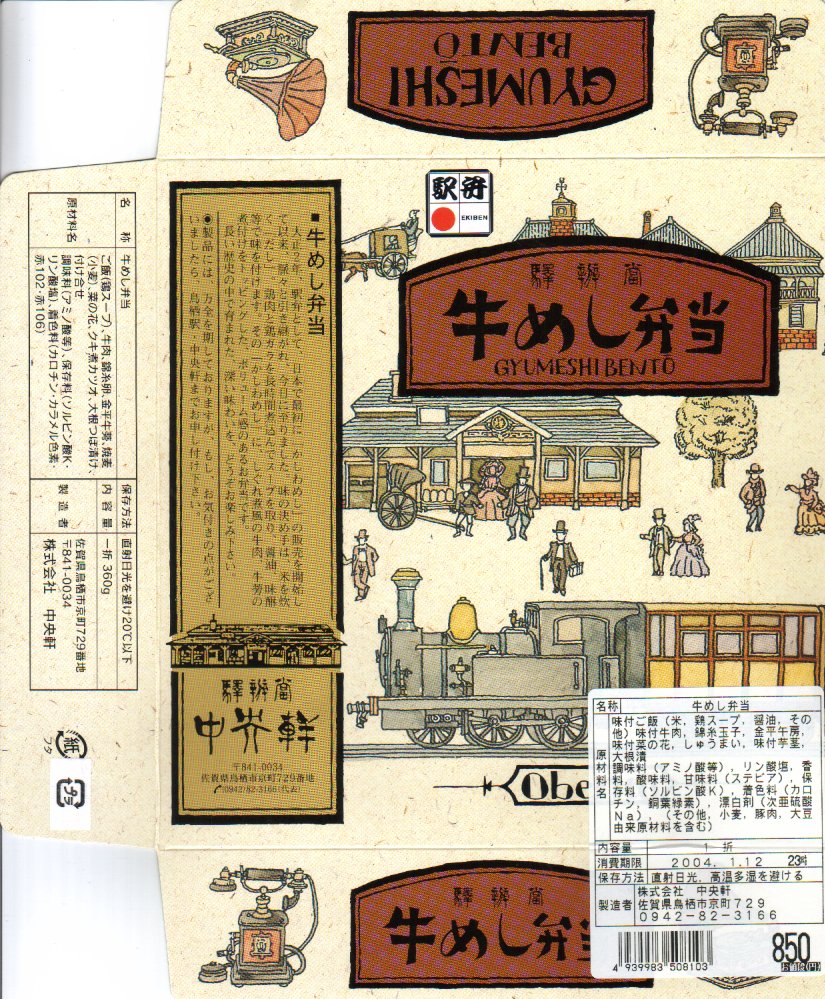 鳥栖駅の駅弁「焼麦弁當」などと同じ正方形の容器に、レトロモダンでハイカラな鉄道風景やアイテムを描いた掛紙兼用のボール紙のふたをする。中身は味付け御飯の上に錦糸卵を敷き、しぐれ煮風の牛肉とごぼうの煮付けなどを載せるもので、焼麦こと焼売がひとつ付く。写真は東京の百貨店の駅弁大会で購入したものなので、見た目の悪さは割り引く必要があるが、メインの牛肉が少量で硬く、一方で「かしわめし」と共通の御飯はおいしいので、やはり鳥栖の駅弁は焼麦と鶏飯が良いなと思う。2006年頃に販売を終えた模様。