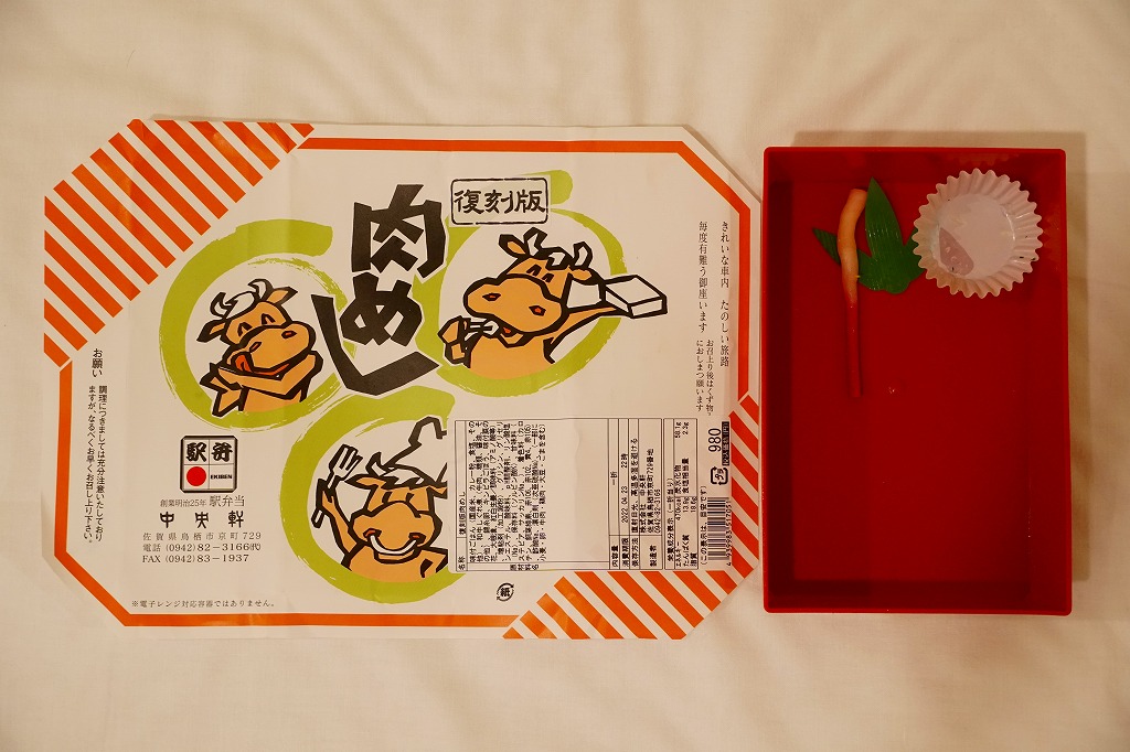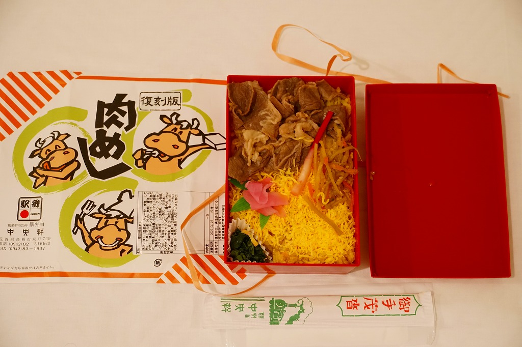 掛紙の絵柄は、当時も今も久留米駅でみられる「肉めし」のものに「復刻版」の表記を加えたもの。赤くて硬い長方形のプラ容器に、カレー粉の味付飯を敷き、和牛しぐれ煮と錦糸卵で覆い、きんぴらごぼう、はじかみ、菜の花、大根漬を添える。昭和の昔の牛肉駅弁の雰囲気を、常温でうまくなかった赤黒く硬い肉を個性だと受け入れさせる工夫を、再現したようには思える。復刻版を名乗るわりには、かつてのものとは容器に加えて内容も味も差異が大きいと感じる。価格は2022年の発売時で980円、2024年12月から1,080円。