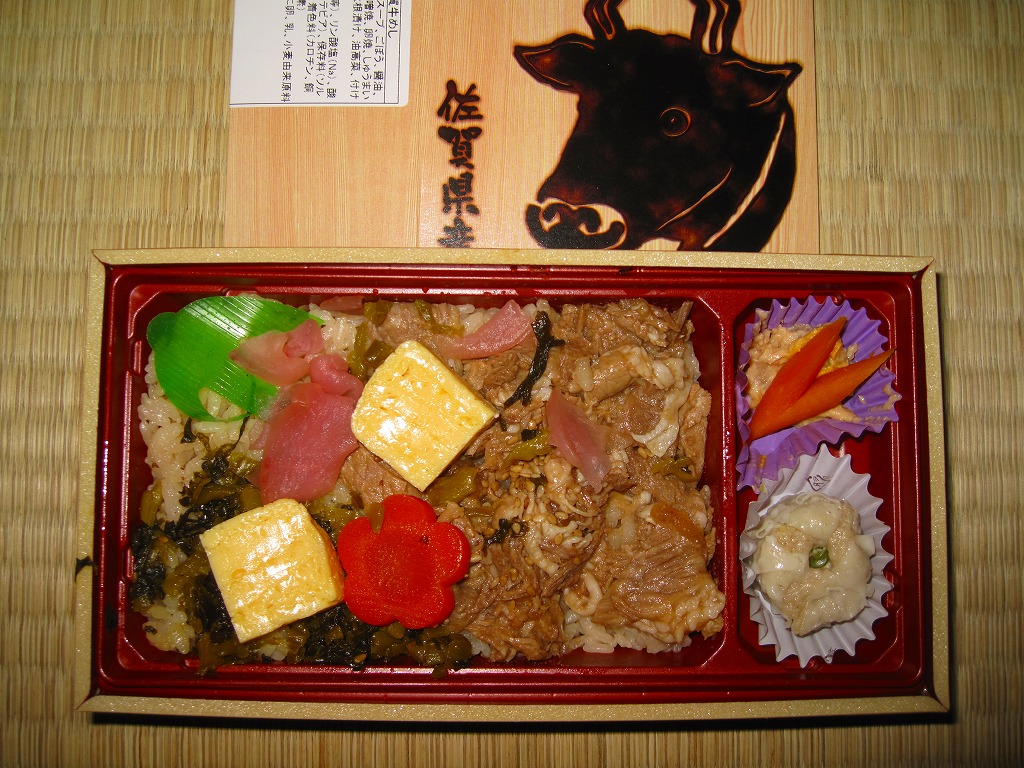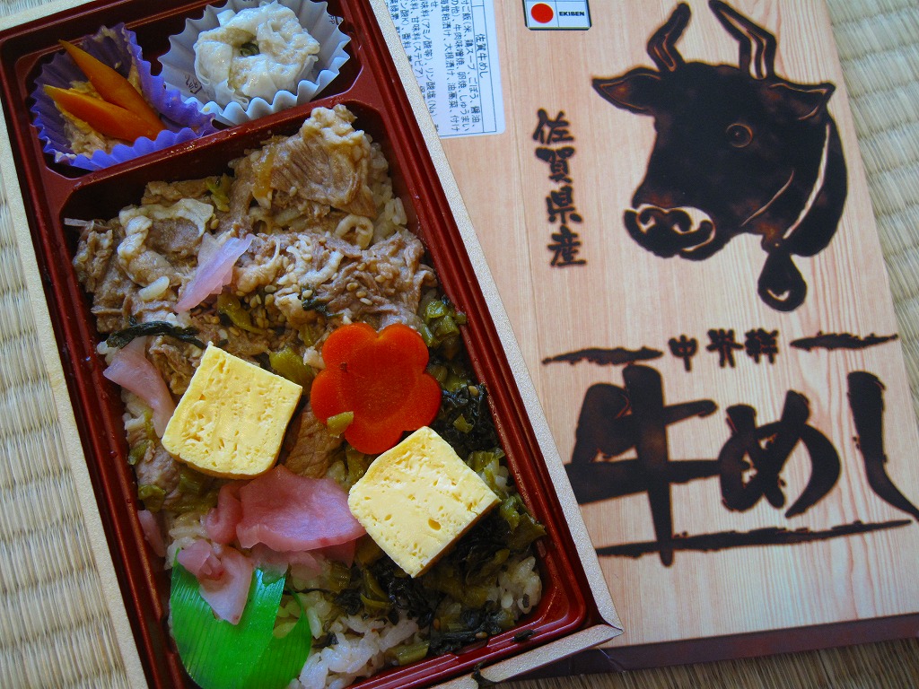 下記の駅弁「牛めし弁当」の、2011(平成23)年時点での姿。長方形の容器に透明なふたをして、牛顔や駅弁の名前を焼き印のように印刷した木目柄なボール紙の枠にはめる。中身は鶏ガラスープの味付飯の上を佐賀牛の牛肉味噌煮と高菜の油炒めである程度覆い、玉子焼、ニンジン、大根漬も貼り、うみたけや焼麦などを添えるもの。