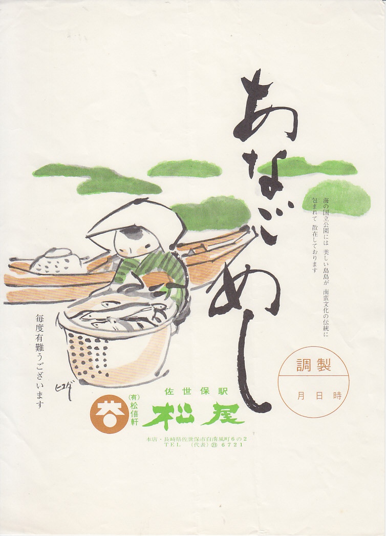 1970年代のものと思われる、昔の佐世保駅弁の掛紙。この舟と籠と魚介と漁師の絵柄は、上記のとおり平成時代まで使われた。