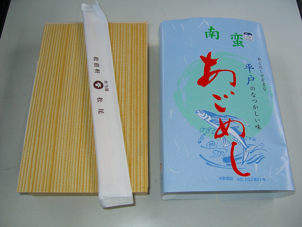 長方形の容器に、アゴの身とだしを含んだ混ぜ御飯を詰め、アゴの身と卵を載せ、煮物や漬物などを添える。「アゴ」とはトビウオのこと。掛紙に「あごだしで有名な」と書かれるとおり、出汁が取れる魚なので、2003年に食べた時は御飯にも身にもとてもダシが利いている感じがして、2005年ではそこまでいかない軟らかな味。