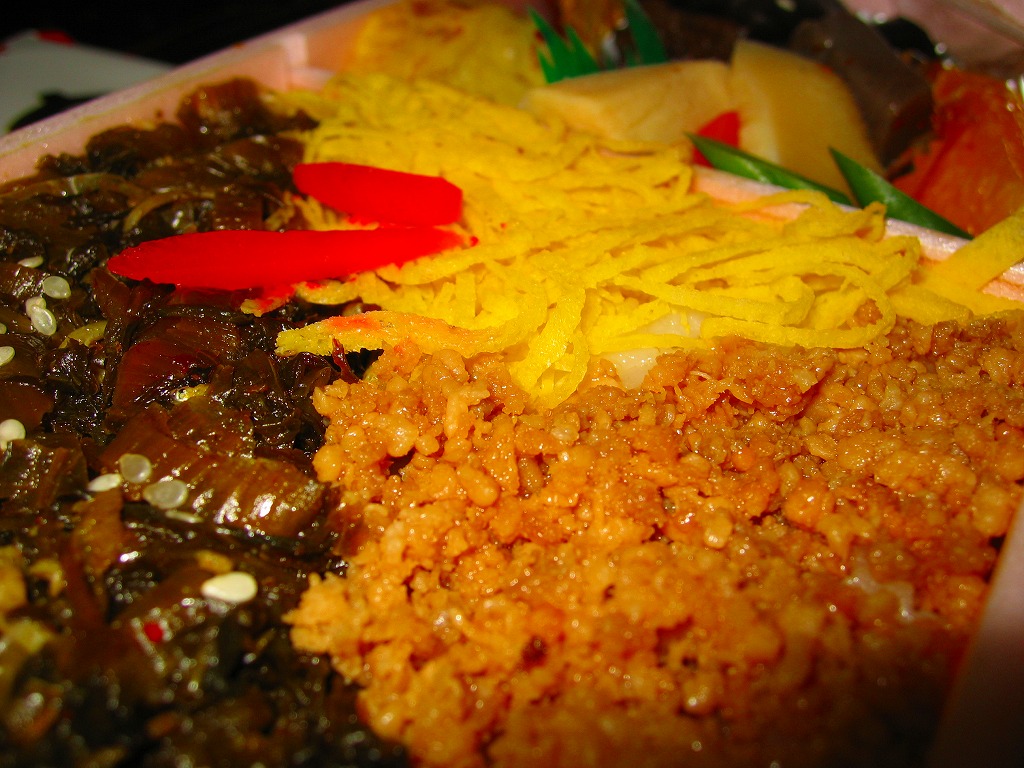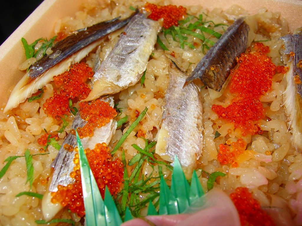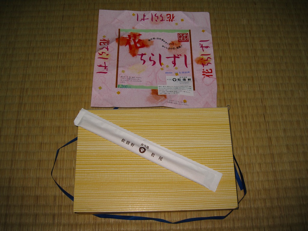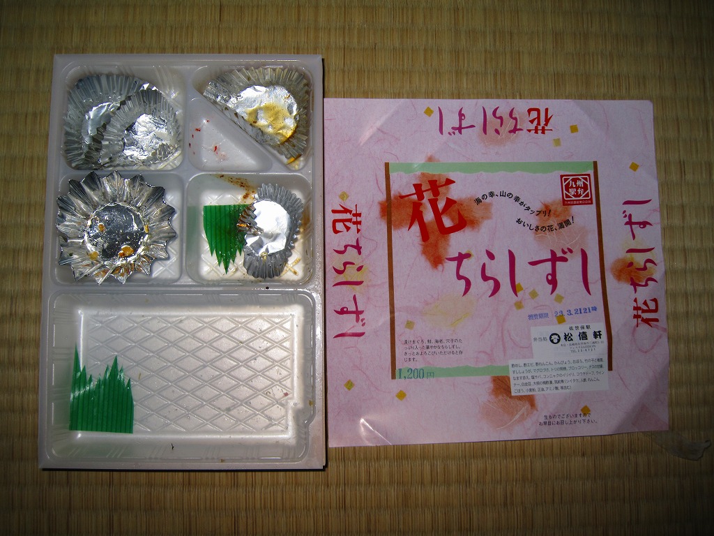 平たい長方形の容器に木目柄のボール紙でふたをして、花色の小さめな掛紙を置く。半透明のプラ製トレーに収まる中身は、ボイルエビやマグロづけやシイタケやレンコンなどを使うちらしずしに、サバ塩焼、鶏照焼、筑前煮、揚げナスなど。単価の高そうな内容だが、佐世保らしさ、駅弁らしさ、豪華らしさが見えてこない。調製元の閉店により、2014年7月限りで終売した模様。
