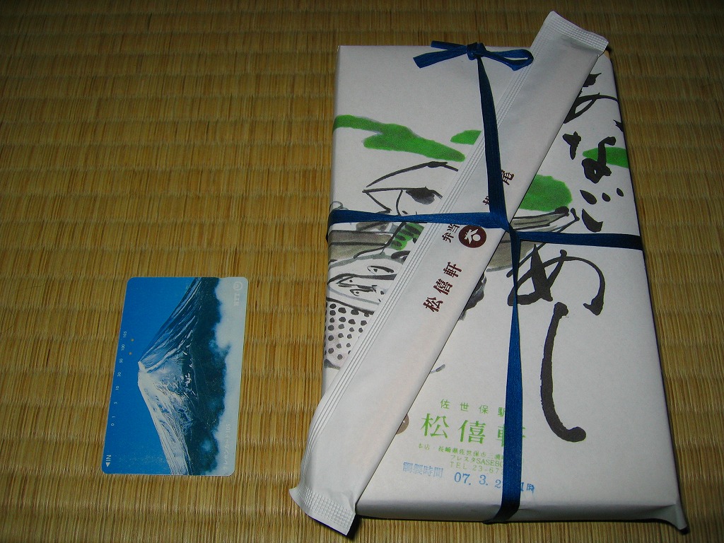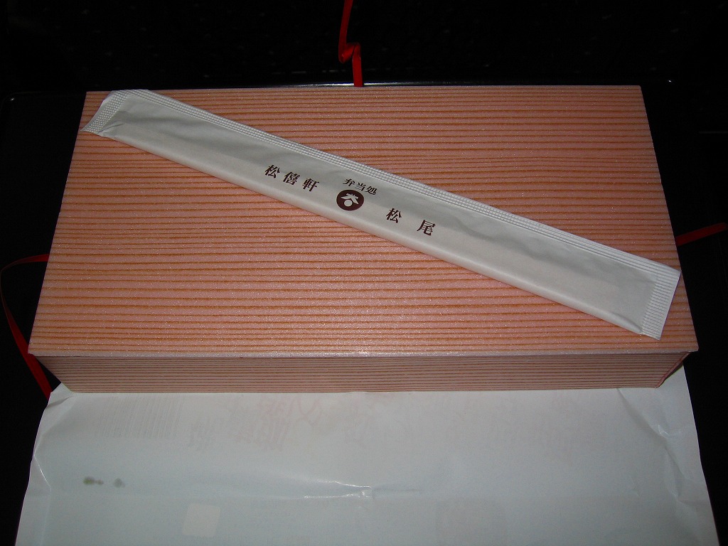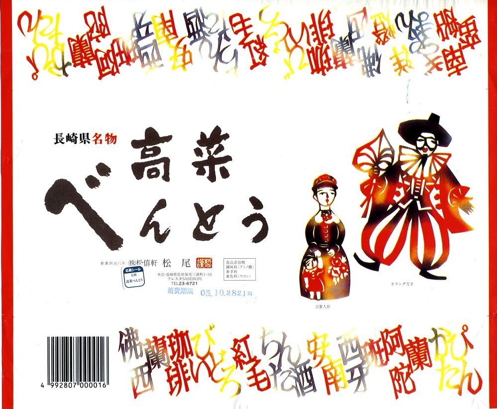 1970年代のものと思われる、昔の佐世保駅弁の掛紙。掛紙に「佐世保駅」と書いてはいるものの、調製元は佐世保駅の駅弁では「松僖軒」(しょうきけん)を名乗ったため、この「松尾」の掛紙は駅弁でなく駅前で売ったり仕出しする弁当かもしれない。