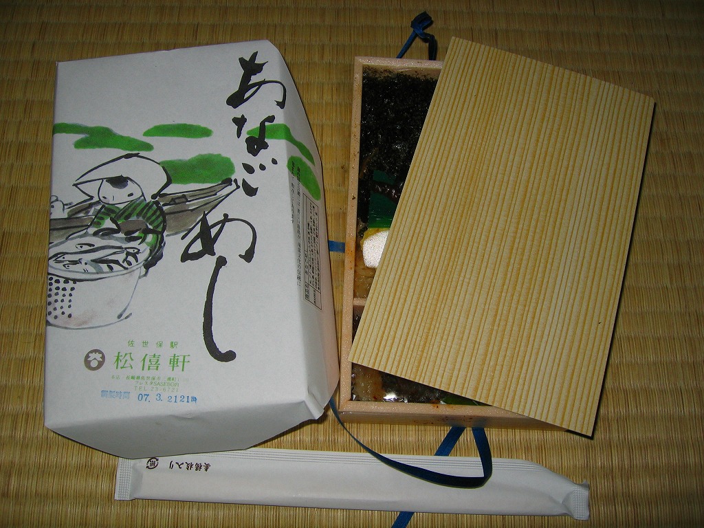 穴子駅弁の分布地図からぽつんと離れて存在した、半世紀の歴史を刻む無名の駅弁。「レモンステーキ弁当」などと同じ容器に、アナゴの炊込飯を詰め、刻みアナゴと刻み海苔で覆い、だし巻き卵を載せ、煮物や酢の物を添える。九州の各地で名物の駅弁となる鶏飯「かしわめし」の、鶏を穴子に替えたようなイメージ。掛紙の絵柄も含めて味わいは並レベルでも、こういうものがあることがよいことで、催事ではなく地元で仕事をする駅弁。調製元の閉店により、2014年7月限りで終売した模様。