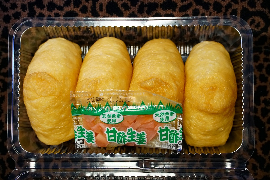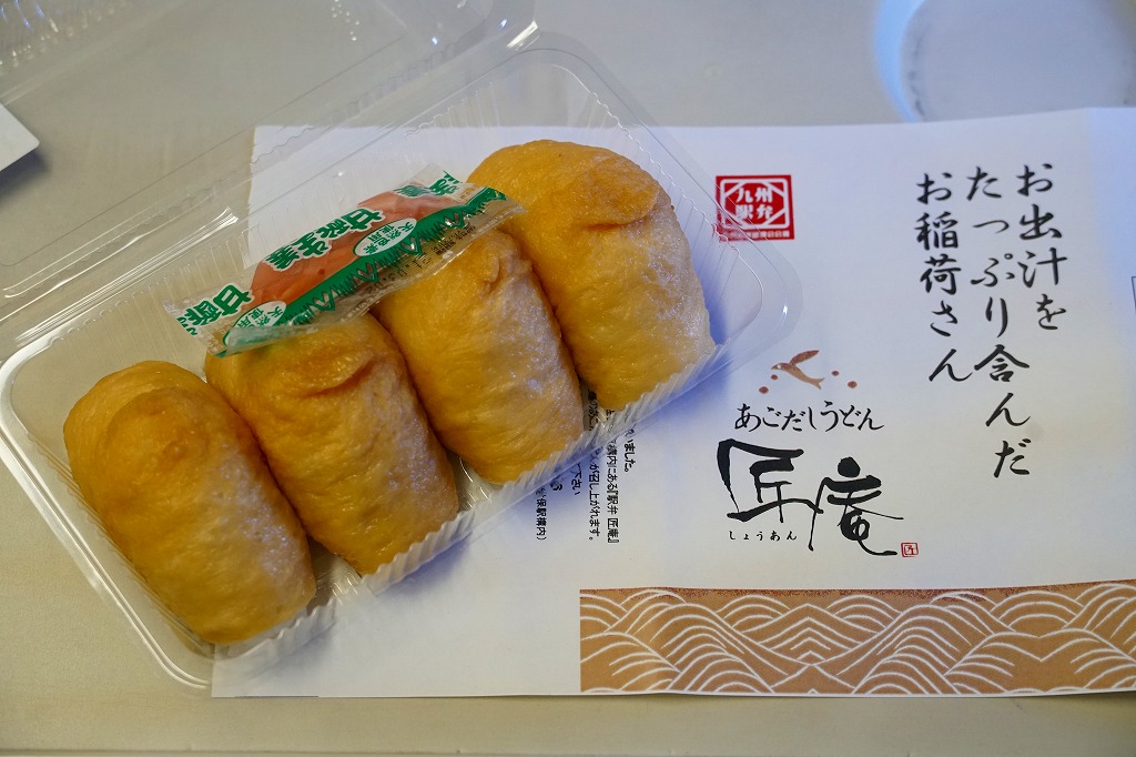 2015(平成27)年8月6日に佐世保駅でオープンしたうどん店「匠庵」の店頭で売られる商品。五目飯をお出汁あるいはうどんの汁を吸ったお揚げで包んだ、淡い色をした二等辺三角形のおいなりさんを、透明なプラ容器に4個収め、商品名を書いた掛紙を巻く。