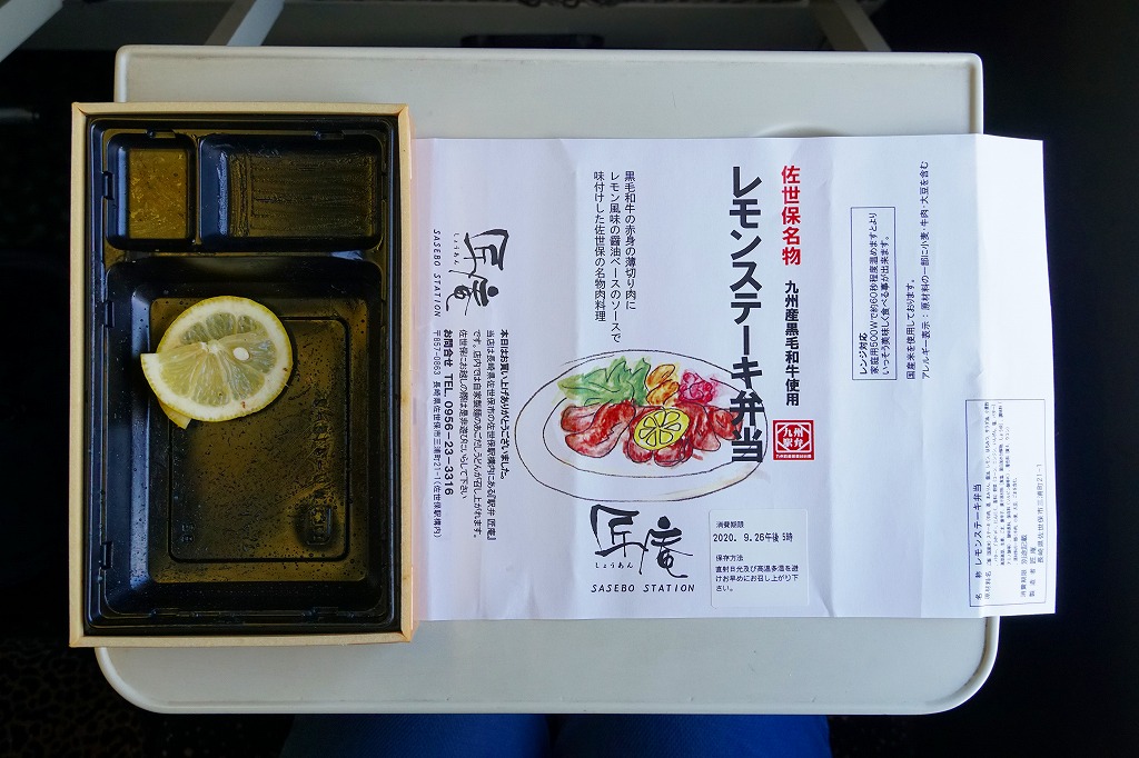 レモンステーキとは、この駅弁の調製元が佐世保市内で1955(昭和30)年に創業した食堂「れすとらん門」で、その開店当時あるいは昭和40年頃に考案されたメニューだという。厚切り肉ではなく日本人に合いそうなすき焼き肉を使い、レモンを使った醤油ベースのソースをかけたもの。地域の特産品によらないご当地グルメの中では、佐世保では佐世保バーガーに次ぐ支持を集めている感じ。