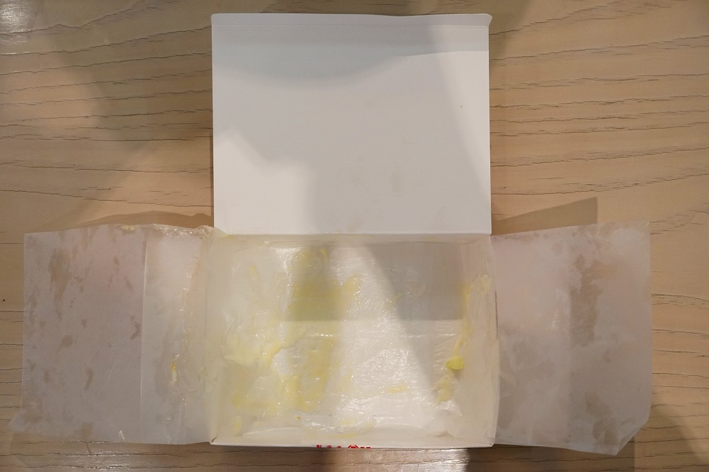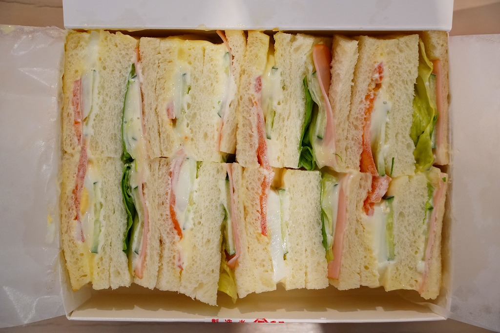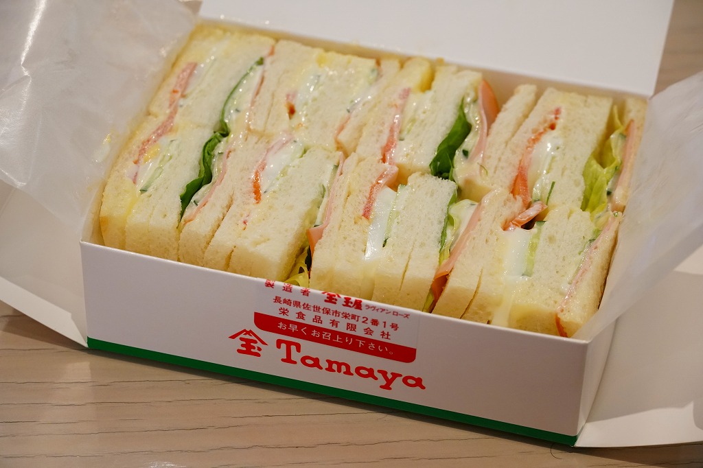 これは駅弁でなく、駅前弁当でもなく、佐世保市街のアーケード商店街にあるデパートで売られる惣菜。百貨店の名を記す専用の紙箱に薄い紙を敷き、キュウリとトマトとレタスとタマゴとハムを水気豊かなたっぷりさらさらのマヨネーズとともに耳なし食パンで挟んだサンドイッチを詰める。1963(昭和38)年からこの百貨店で売られているといい、佐世保のソウルフードとも紹介される、玉屋のサンドイッチ。昭和時代か家庭料理の、昔懐かしい柔らかさ。