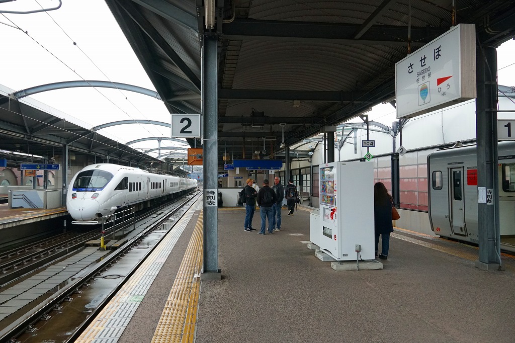 博多から特急列車「みどり号」で2時間弱、佐世保線の終着駅で松浦鉄道との接続駅。佐世保市は九州東部の長崎県北部で瀬戸内海に面する、人口約23万人の港町。造船と軍港で名高いほか、テーマパークや食文化で観光客も集める。駅弁は1948年から佐世保駅で駅弁を販売した松僖軒が2014年7月に撤退、翌2015年8月から改札外のうどん店の店頭に駅弁を並べた匠庵が2022年1月に閉店、駅弁がなくなった。1898(明治31)年1月20日開業、長崎県佐世保市白南風町。